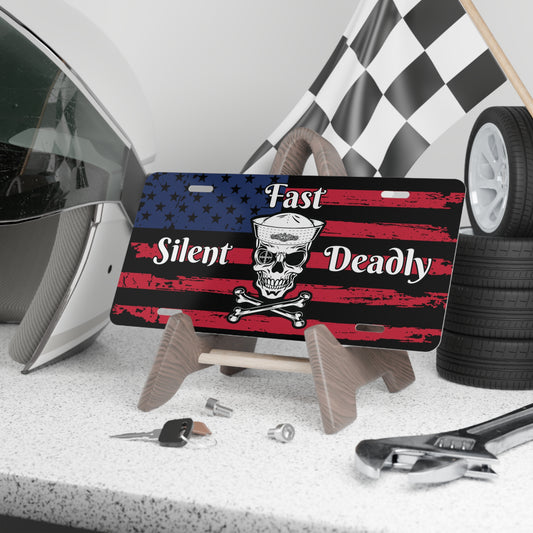 US Navy Silent Fast Deadly Skull & Crossbones on American Flag Vanity License Plate