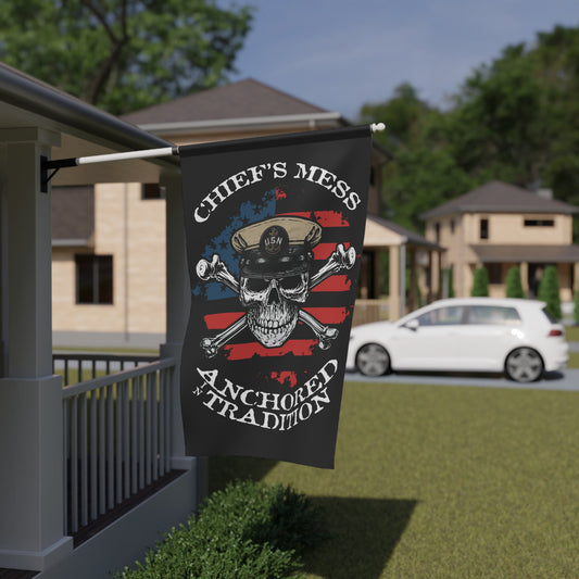 Navy Chief's Mess Anchored Tradition CPO Skull Crossbones Sailor with Distressed USA Flag on Black House Banner
