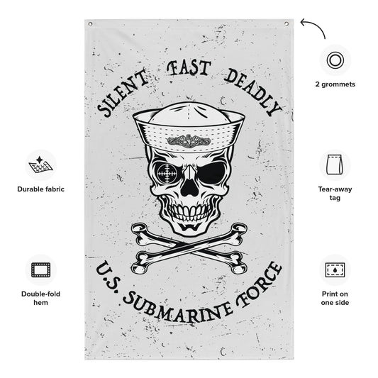 US Submarine Force Silent Fast Deadly Navy Sailor Skull & Crossbones Distressed White Flag