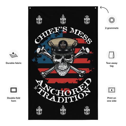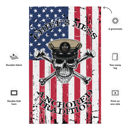 Chief's Mess Anchored Tradition CPO Skull Crossbones with Distressed USA Flag on Black House Banner