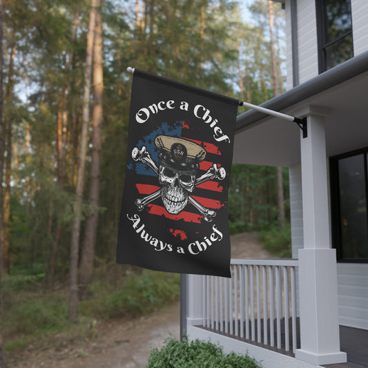 Once a Chief Skull & Crossbones Always a Chief with Distressed American Flag on Black House Banner