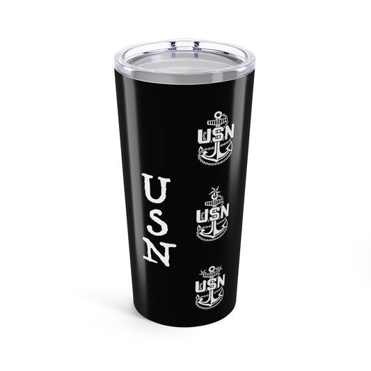 Navy CPO Sailor Skull Crossbones Chief's Mess Anchored Tradition with Distressed US Flag Stainless Steel Tumbler 20oz