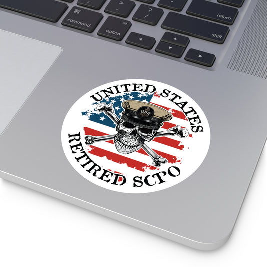 United States Retired SCPO Skull Crossbones Senior Chief Petty Officer with Distressed American Flag Master Round Sticker