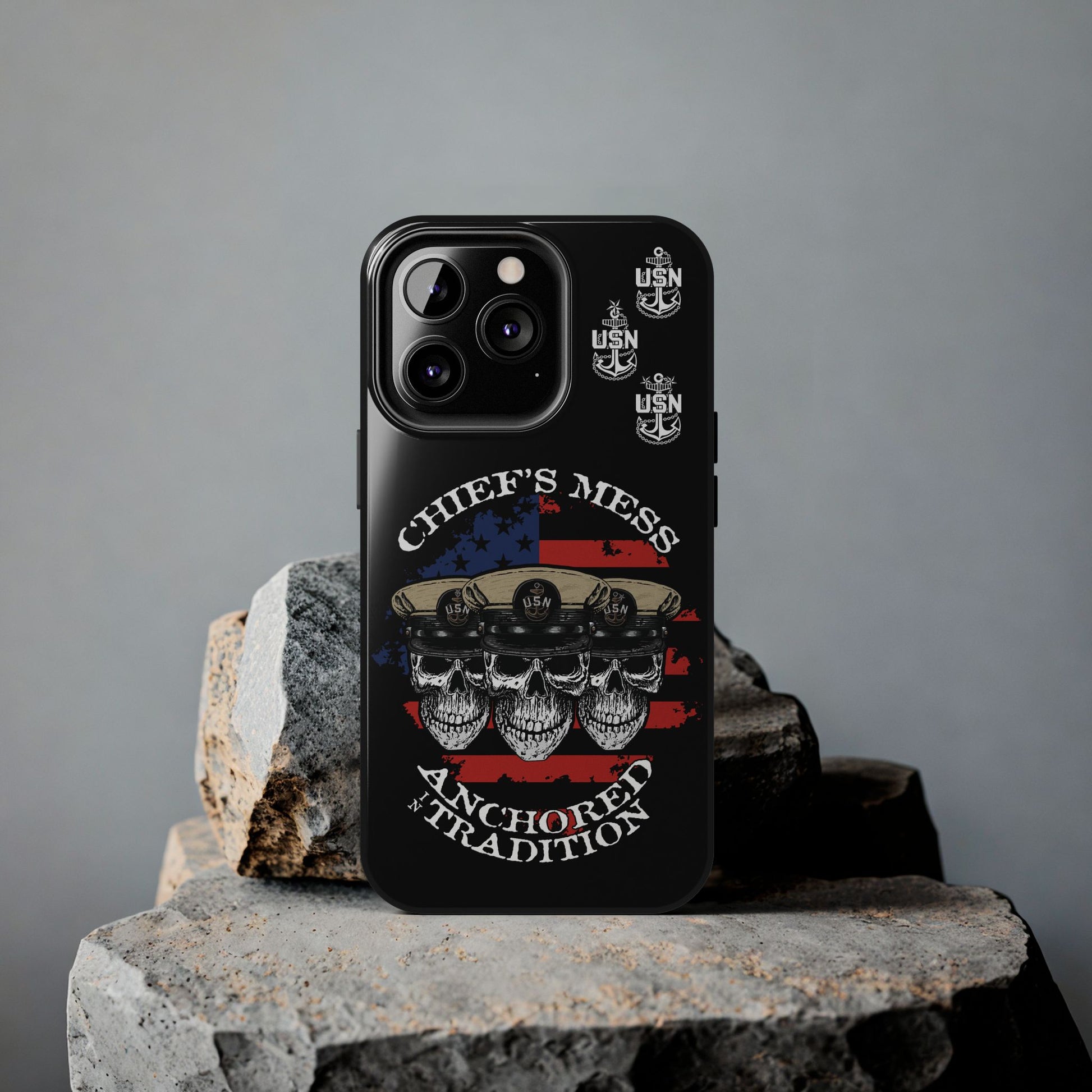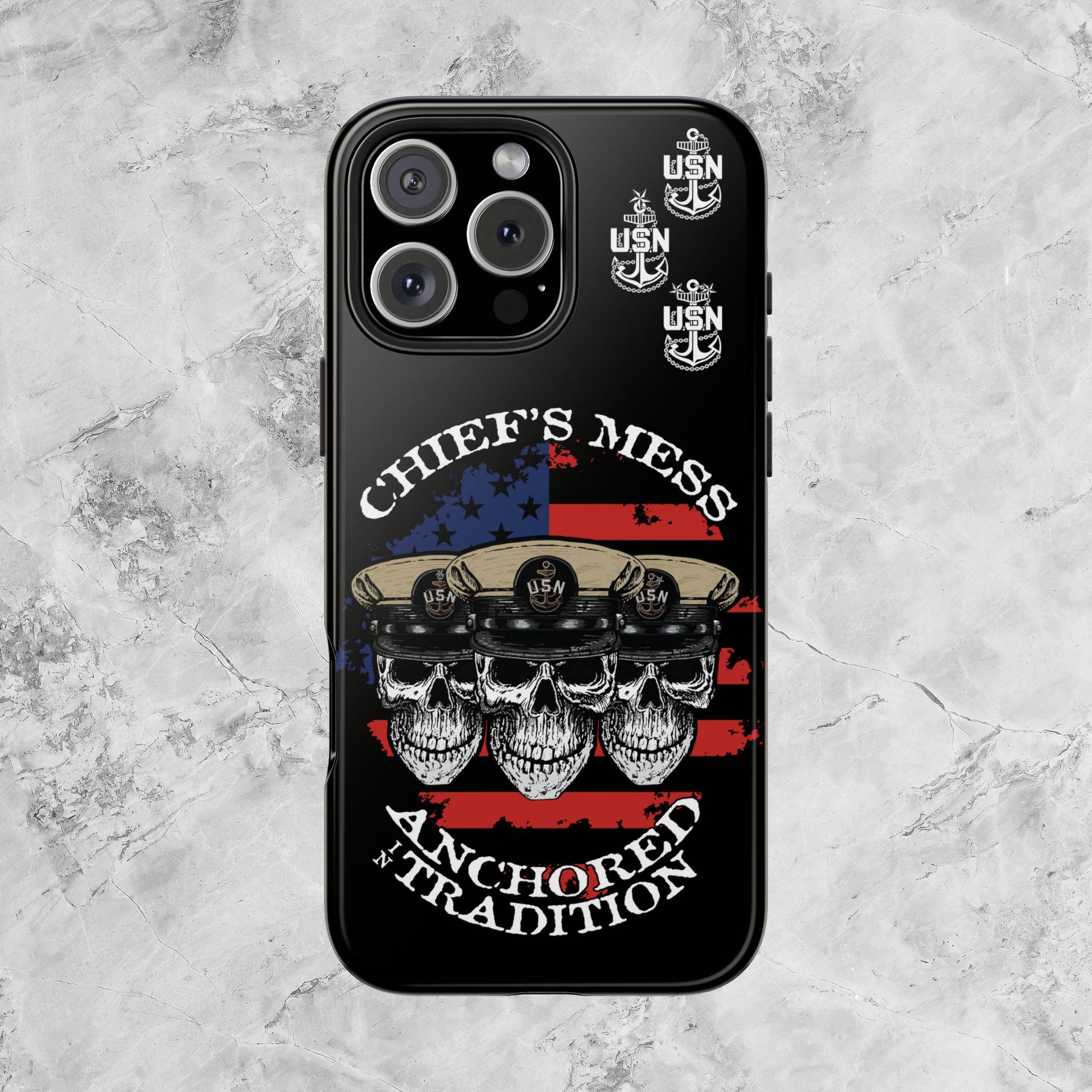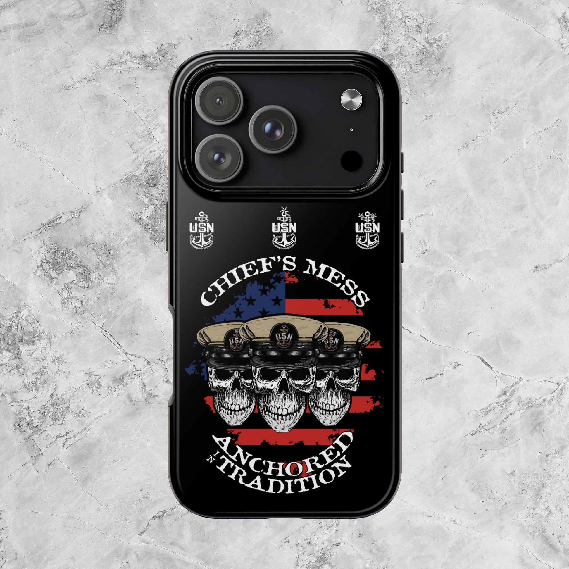 Chief's Mess Anchored Tradition CPO Sailor Skulls on Distressed USA Flag Black Tough iPhone Case