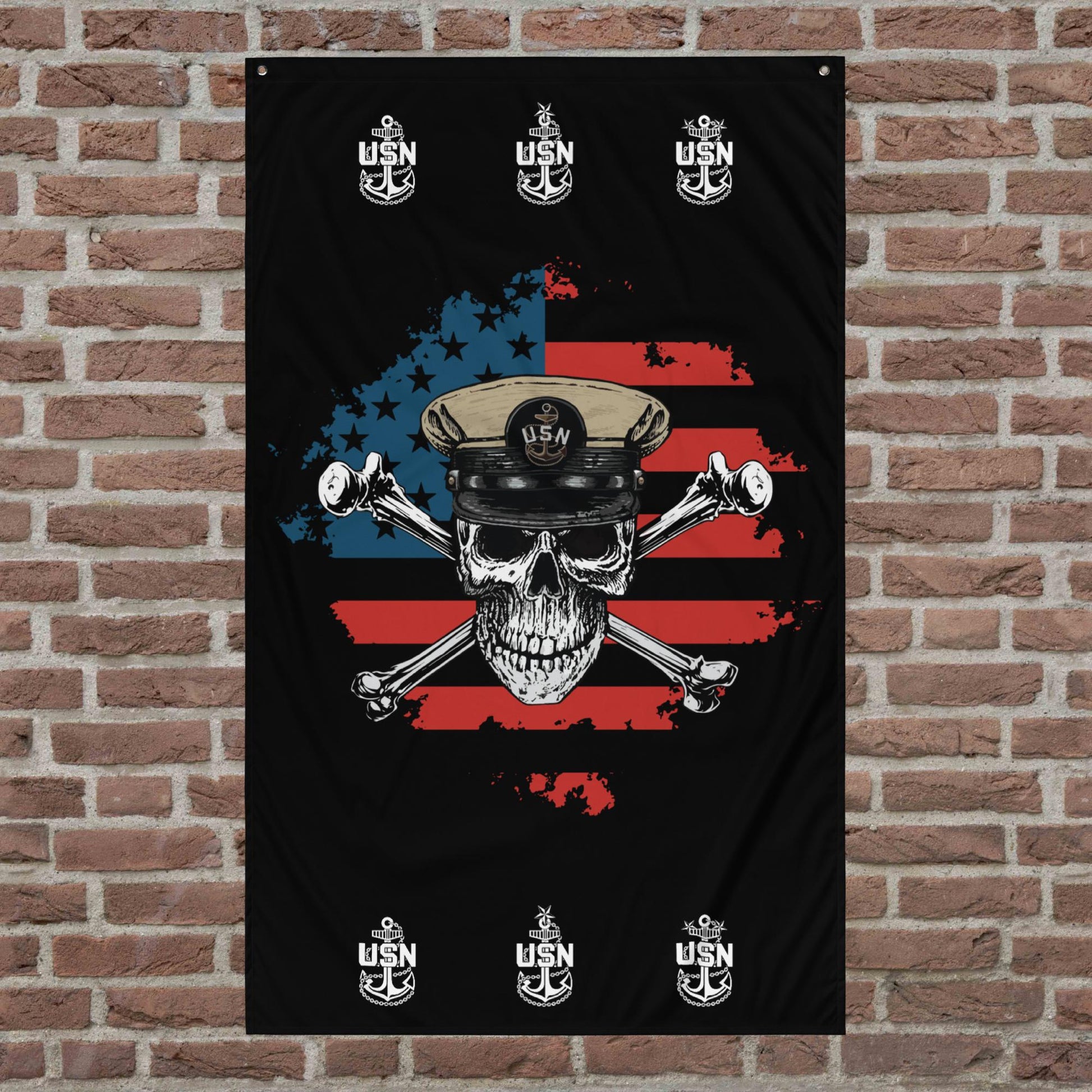 This design shows U.S. Navy Chief Skull and Crossbones over a tattered American flag.