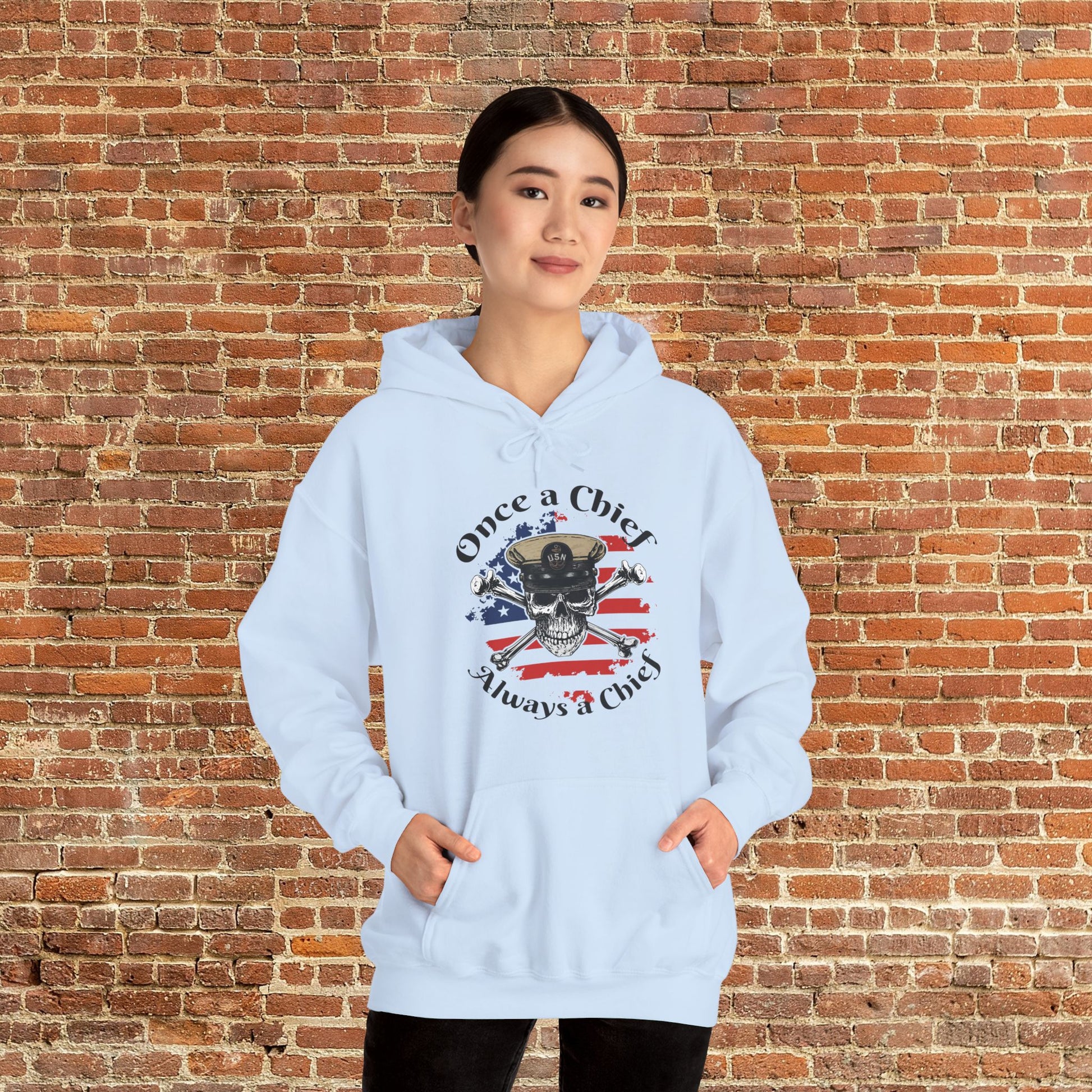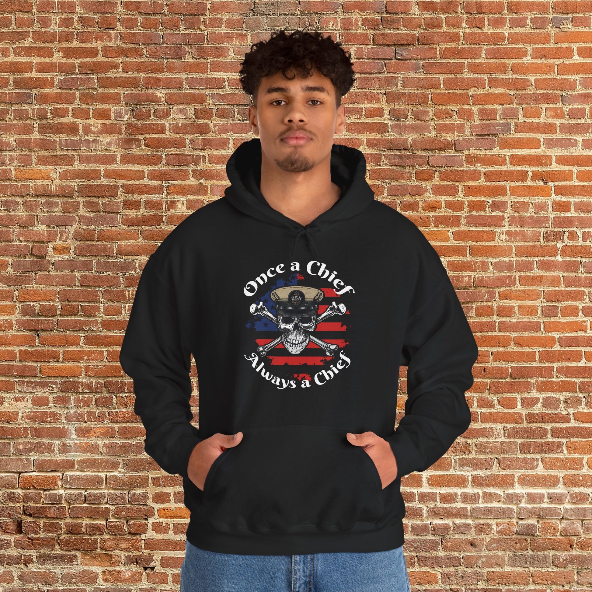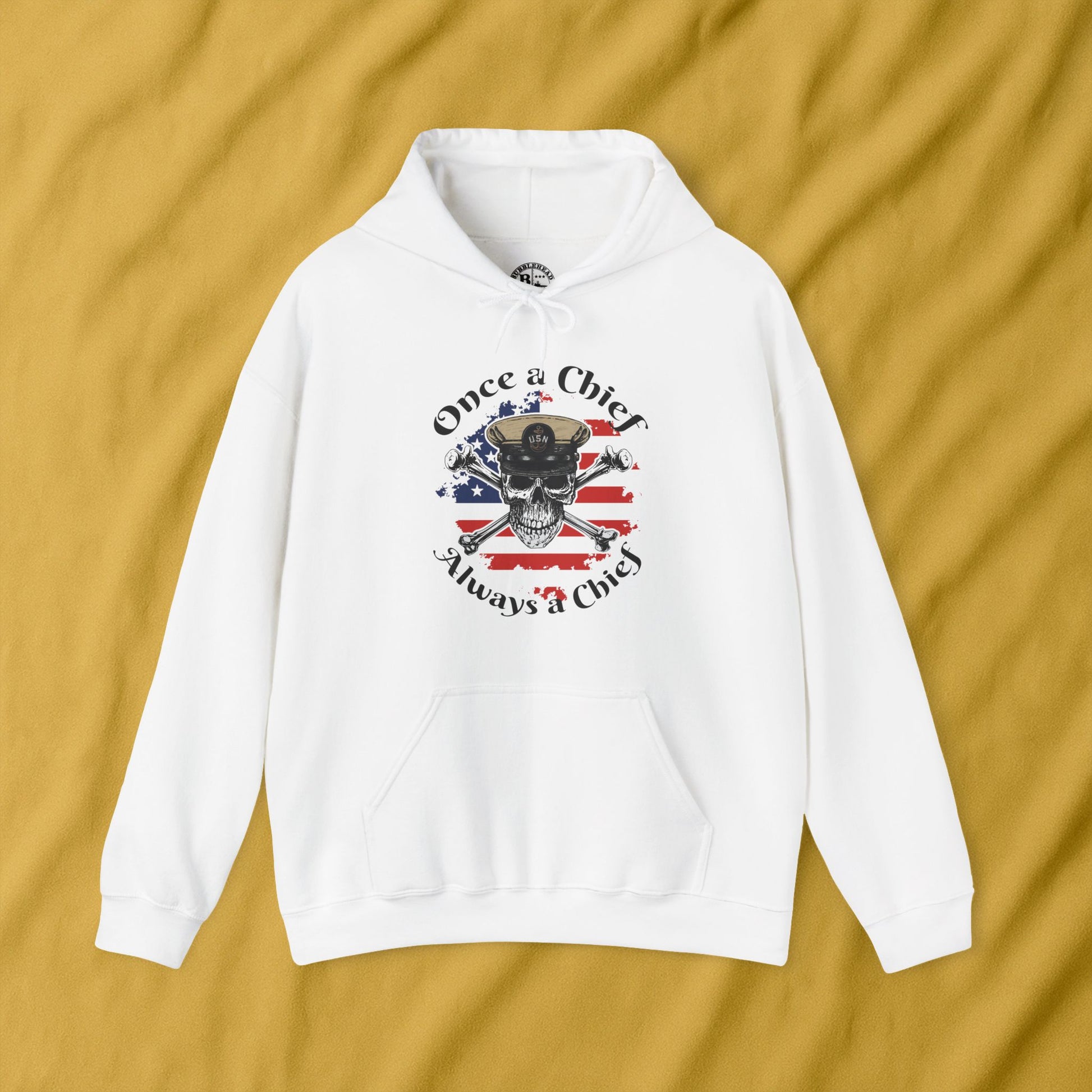 Once a Chief CPO Skull & Crossbones Sailor on Distressed USA Flag Unisex Heavy Blend™ Hooded Sweatshirt