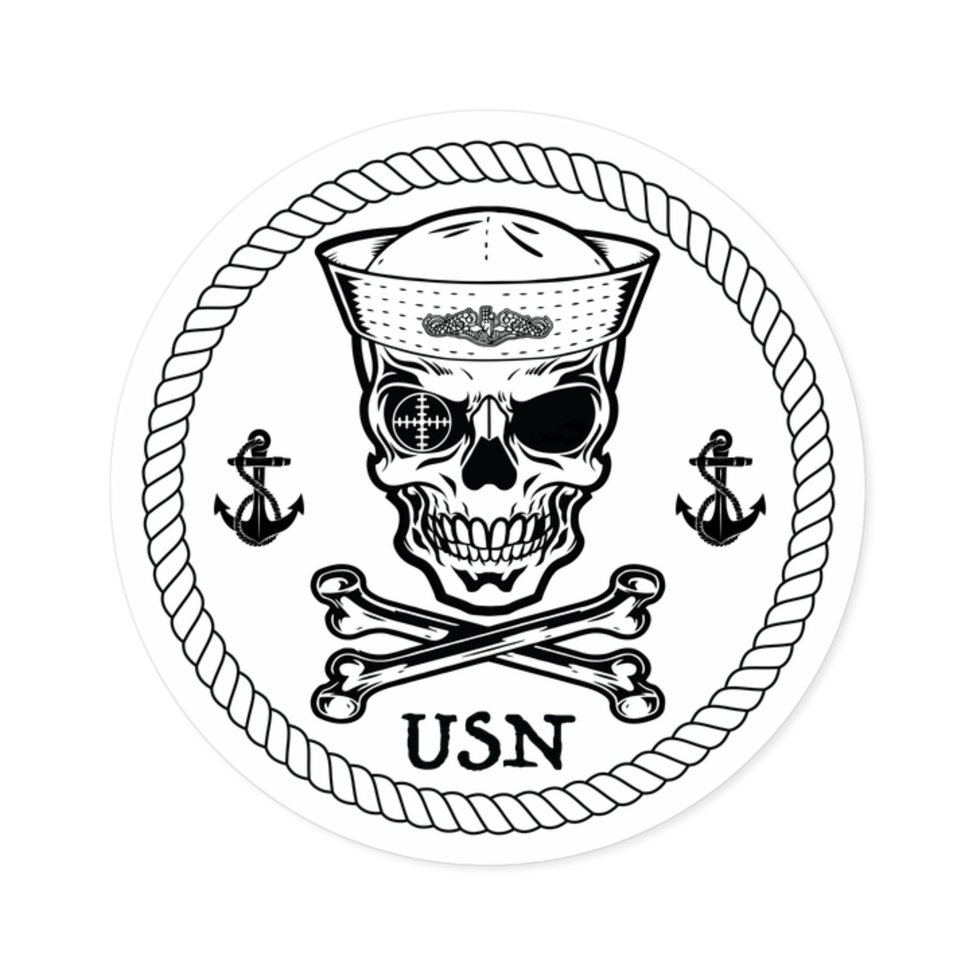 Submarine Force Skull Crossbones Sailor with Dolphins and Anchors Round Stickers.