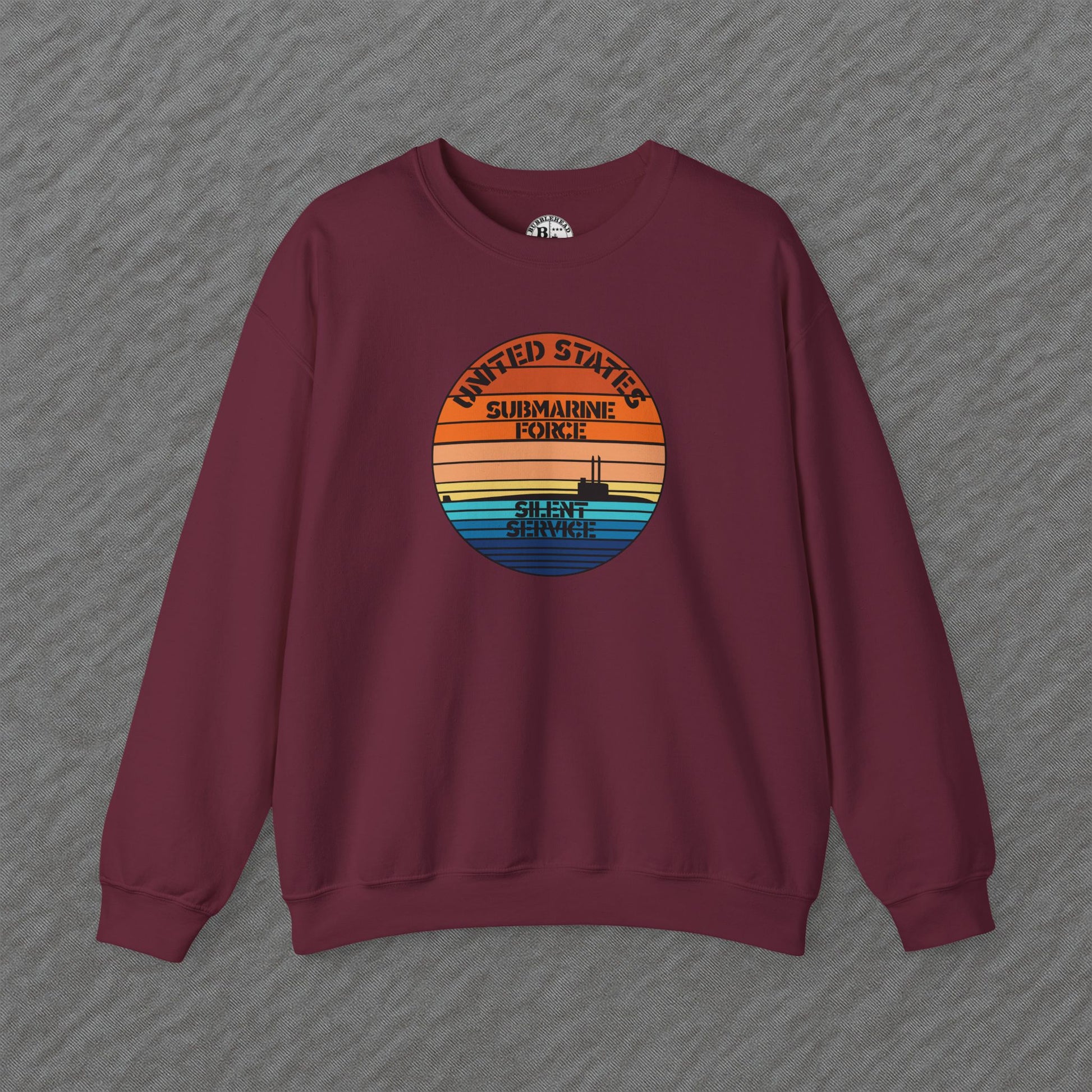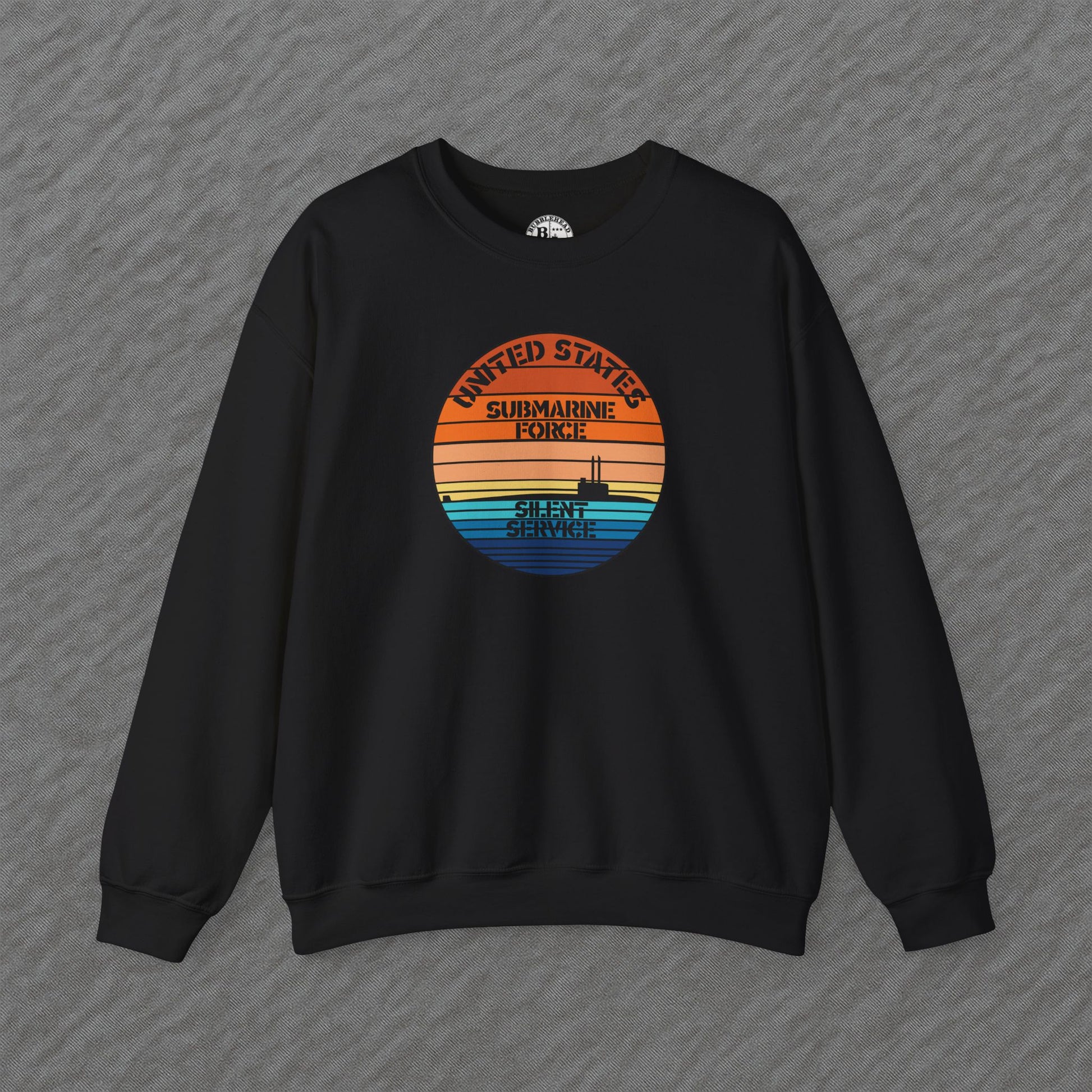 Sunset Retro US Navy Submarine Force Silent Service Vintage Pullover Crewneck Sweatshirt. This design shows a United States submarine in a body of ocean water, complete with some mast and antennas raised (which ones are a lookup for you). Perfect gift for an active duty submariner still serving our military, a veteran or a retired submariner that has also served in the silent service. So if you're a veteran or currently serving on submarine duty in the United States of America's naval fighting force then grab yourself this design and show your pride of being a member of the greatest Naval Fleet in the world. ‘Merica! This design makes for a great gift for that active duty, veteran or retired sailors to show their military affiliation.