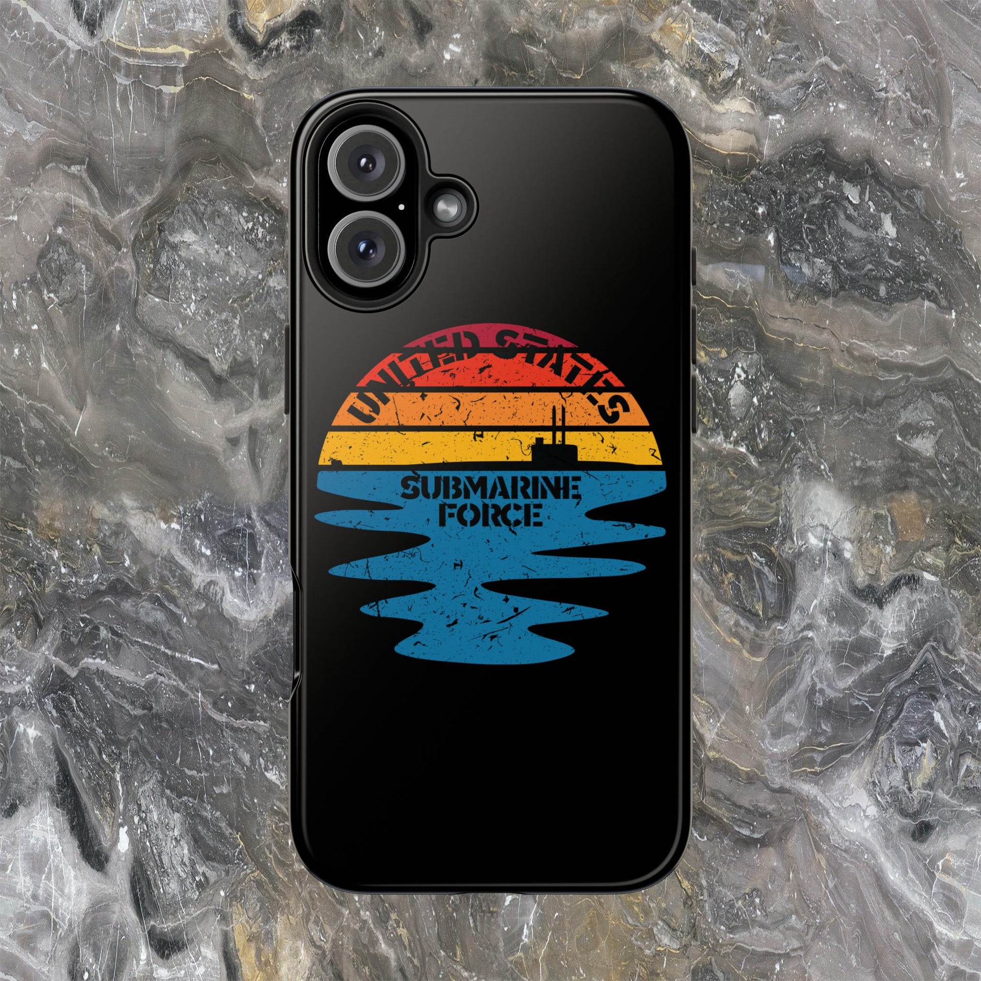 Show your Silent Service pride with this bold and stylish iPhone case featuring a retro-style sunset silhouette of a surfaced submarine. Designed for submariners, veterans, and proud supporters, this case is more than protection, it’s a statement.