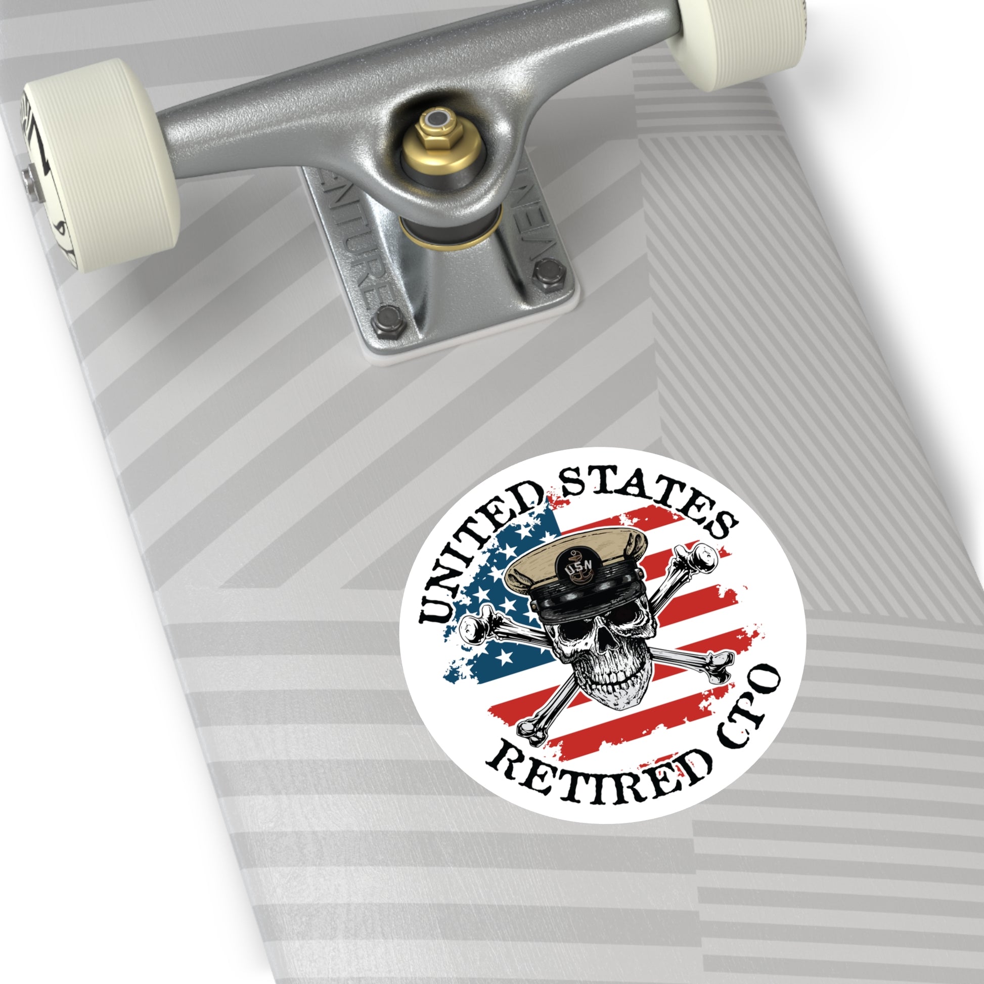 U.S. Retired CPO Skull Crossbones Chief Petty Officer with Distressed American Flag Round Sticker