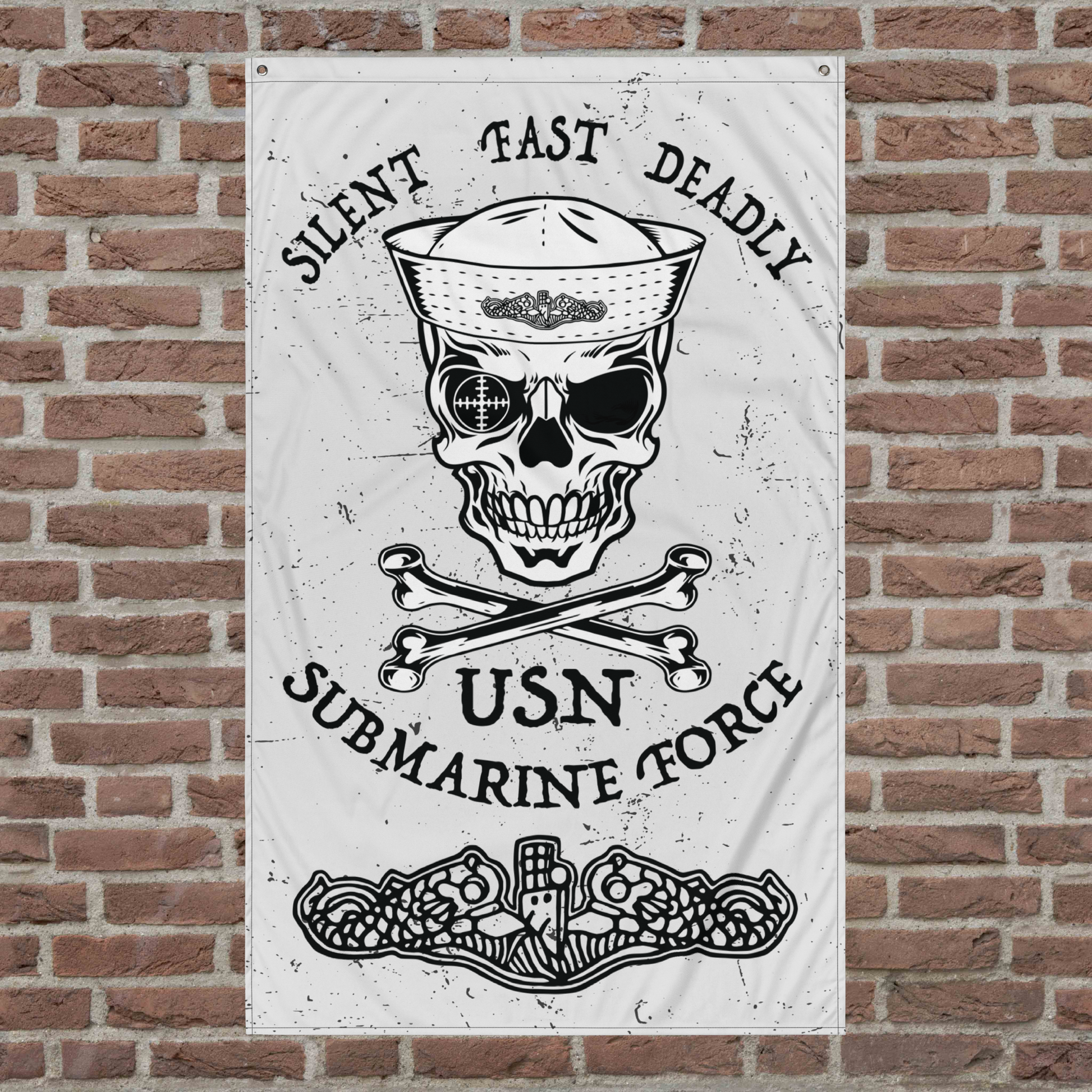 US Navy Submarine Force Dolphins Silent Fast Deadly Skull Crossbones Sailor Distressed White Flag