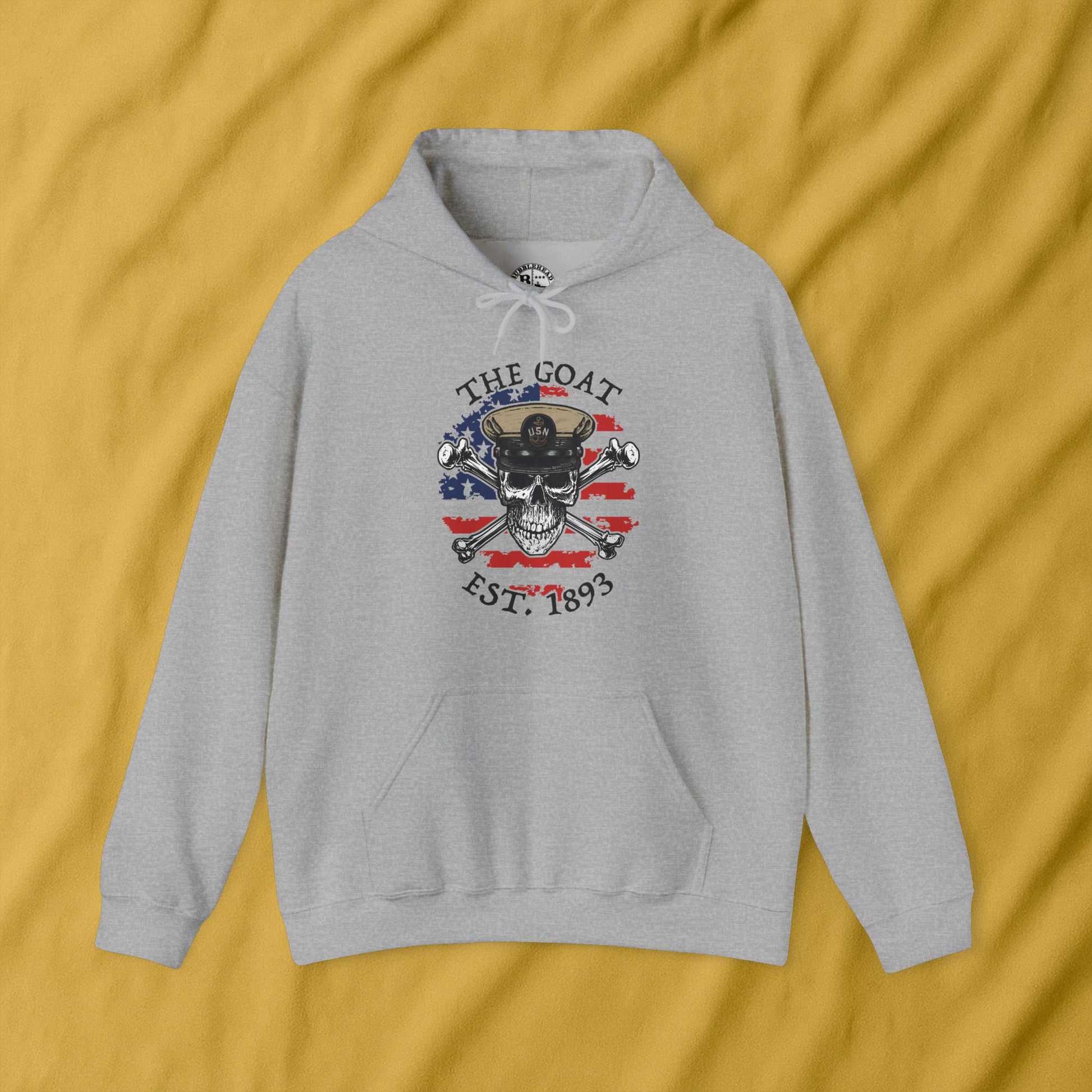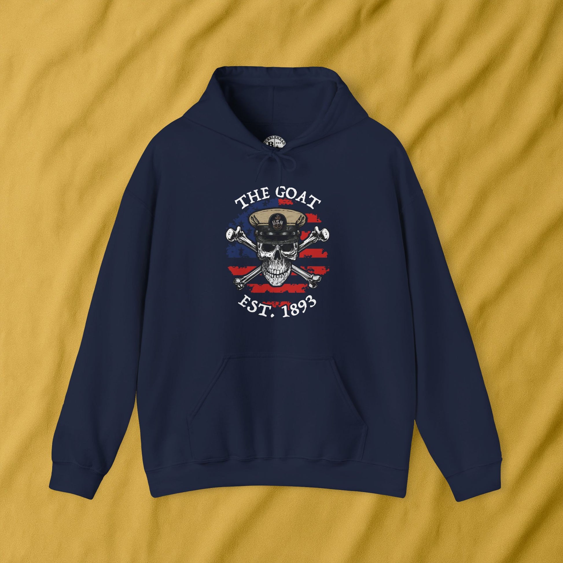U.S. CPO Skull Crossbones "The Goat Est 1893" CPO Pride Unisex Hoodie Sweatshirt. Honor the legacy. Embrace the grit. Represent your rank with this bold Naval CPO hoodie featuring a battle-worn skull and crossbones design topped with the iconic CPO combination cover. Behind it all? A distressed American flag background and the powerful title: “THE GOAT – EST. 1893.” This hoodie pays tribute to the heritage and brotherhood of Naval Chiefs. Whether you're an active-duty Goat Locker member or a proud retired Chief, this sweatshirt delivers warmth, respect, and attitude in every stitch.