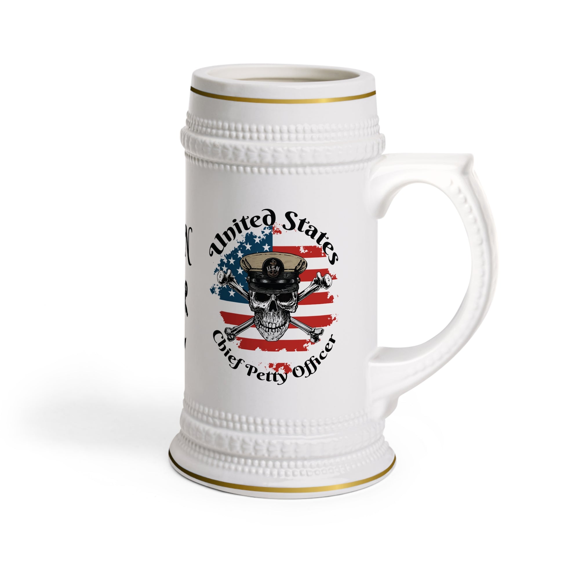 United States Navy Chief Petty Officer Skull & Crossbones on American Flag Stein Mug.