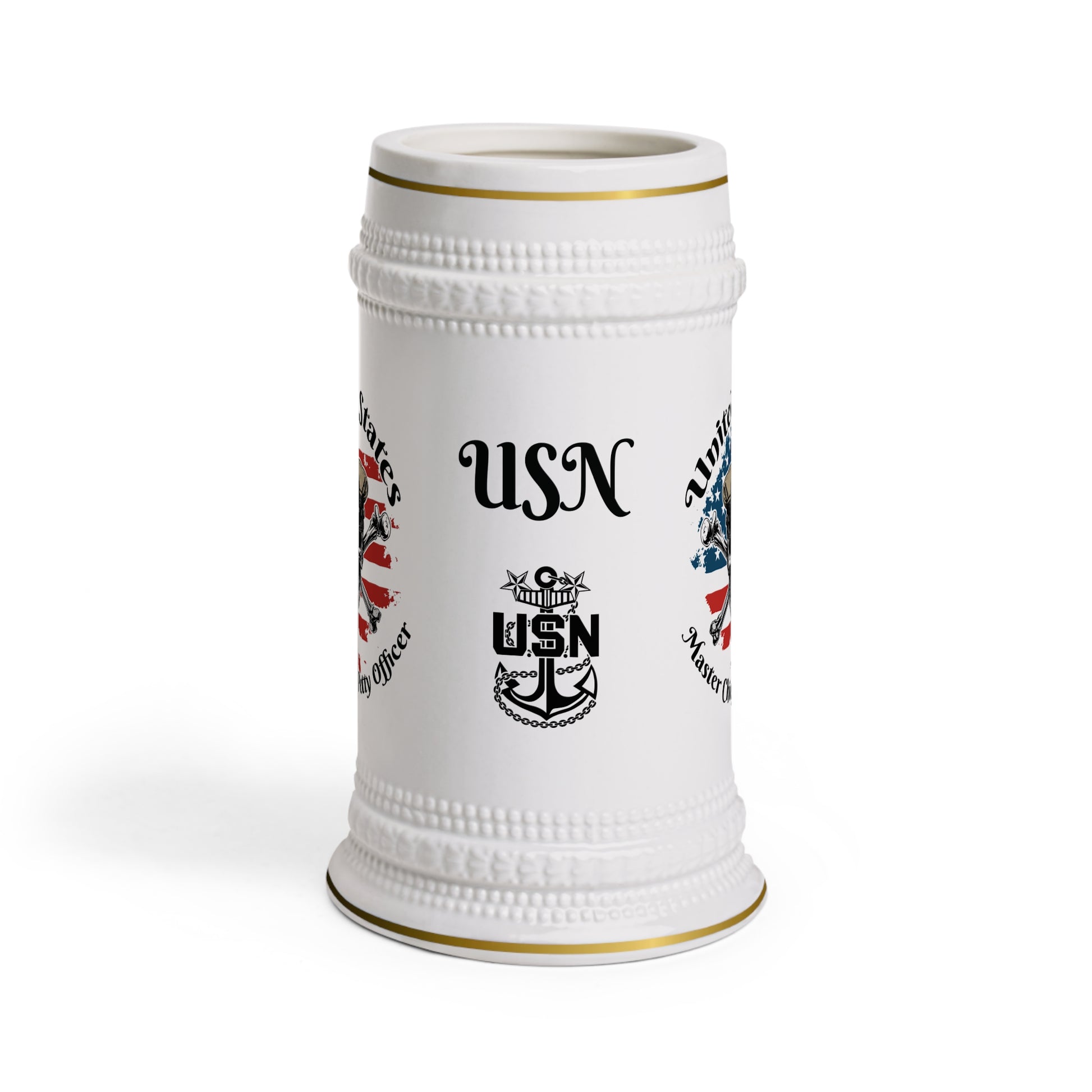 US Navy Master Chief Petty Officer Skull & Crossbones on American Flag Stein Mug.