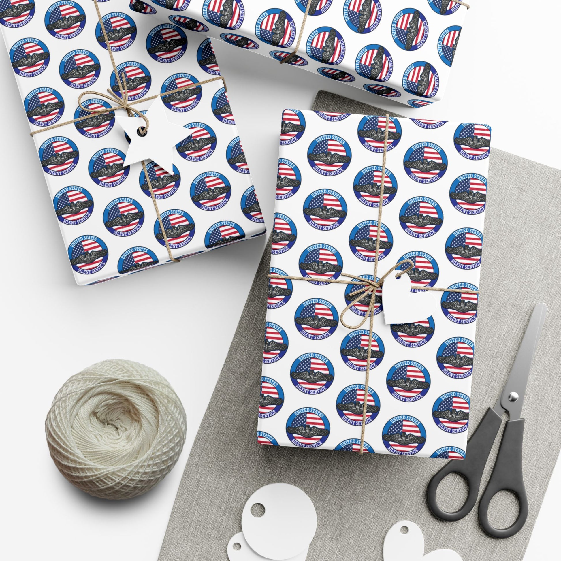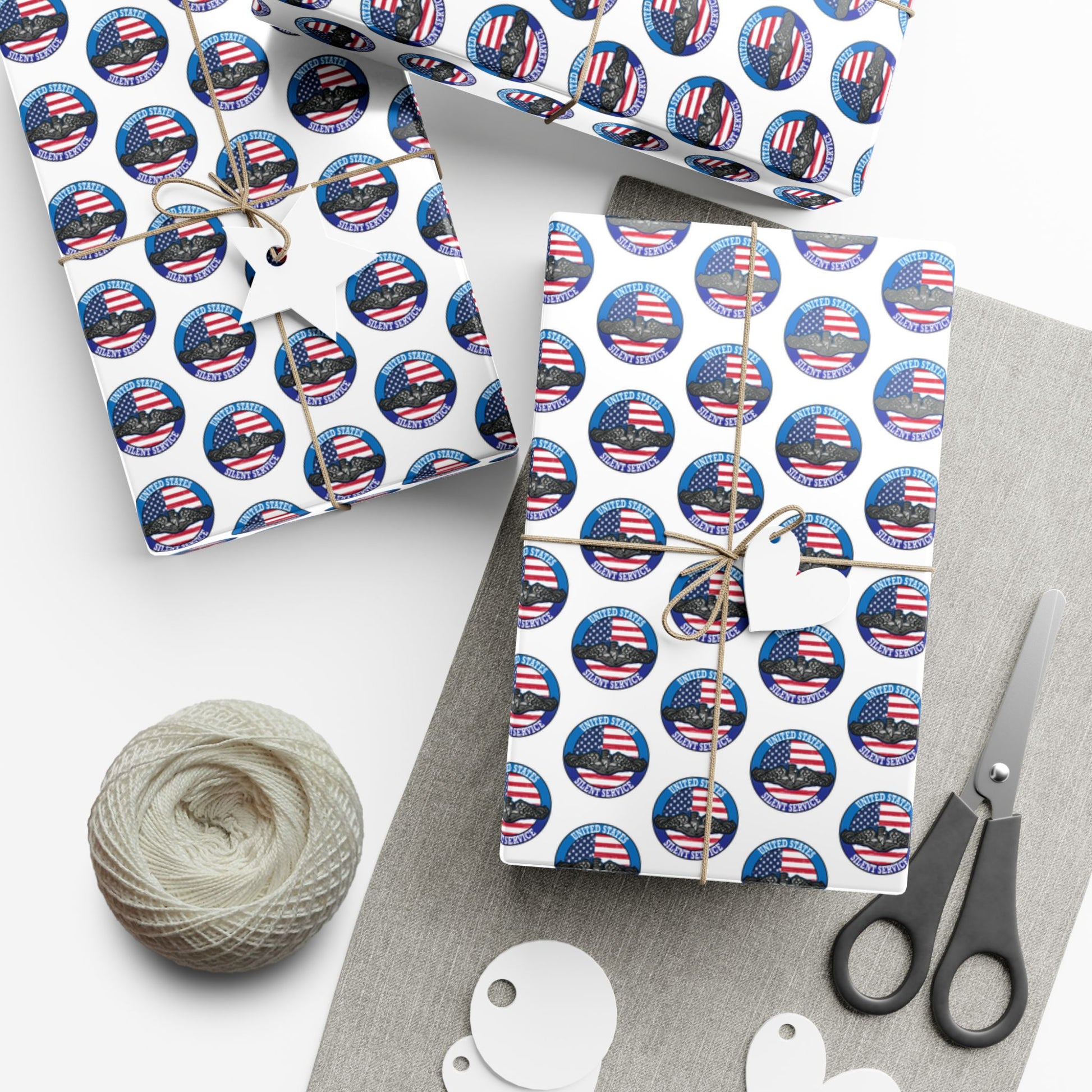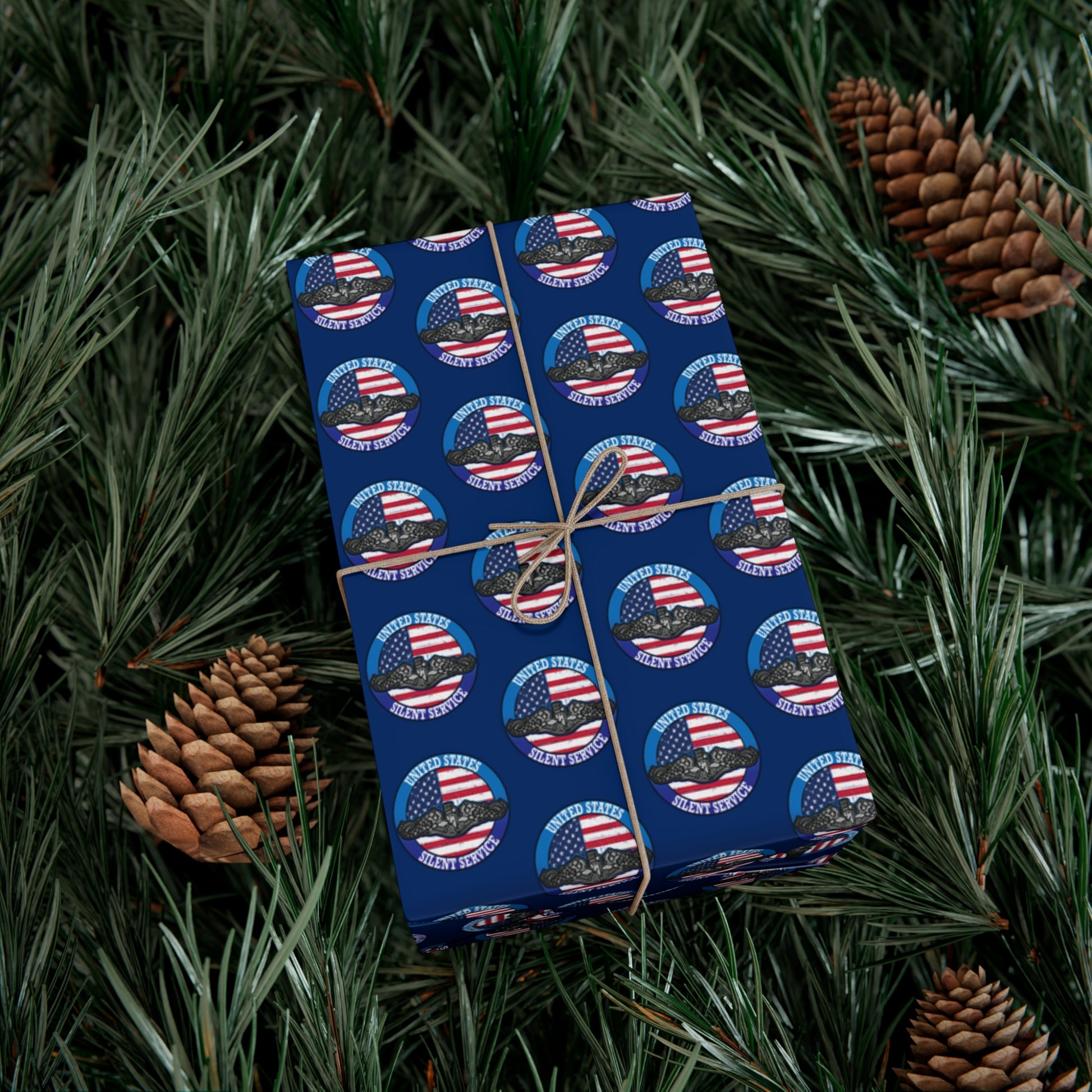Celebrate naval heritage with this bold and patriotic "United States Silent Service" gift wrapping paper. Featuring the iconic silver submarine dolphins insignia over a distressed American flag backdrop, this design honors the strength, sacrifice, and silent pride of the United States Submarine Force.
