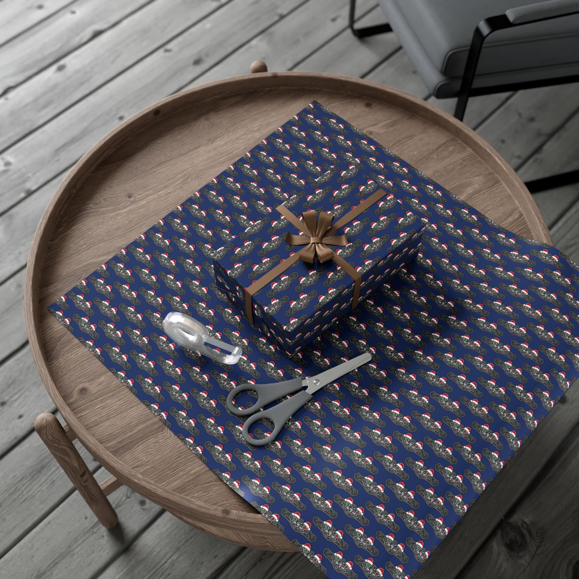 US Navy Submarine Force Silent Service Silver Dolphins with Xmas Santa Hats Blue Gift Wrapping sheets.
