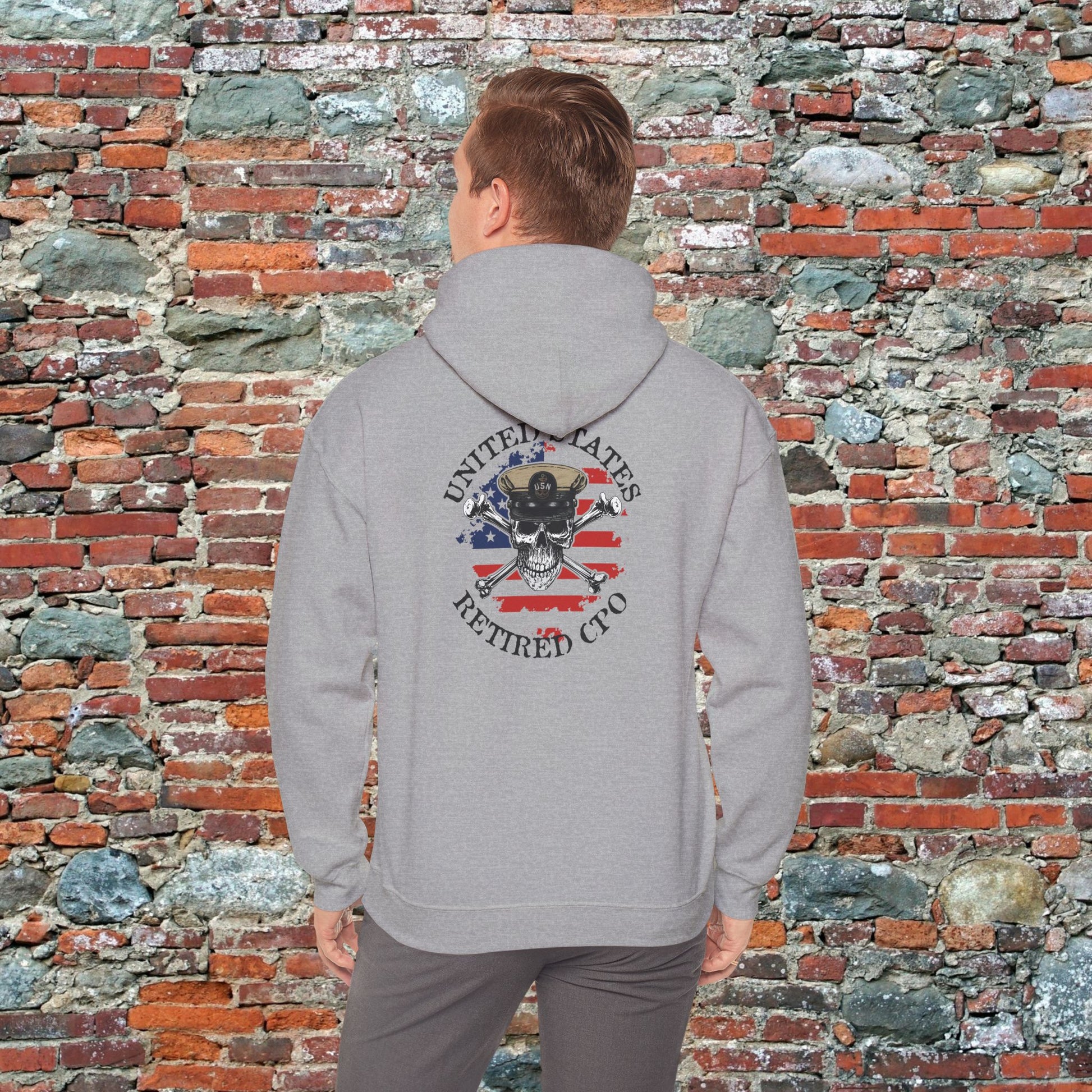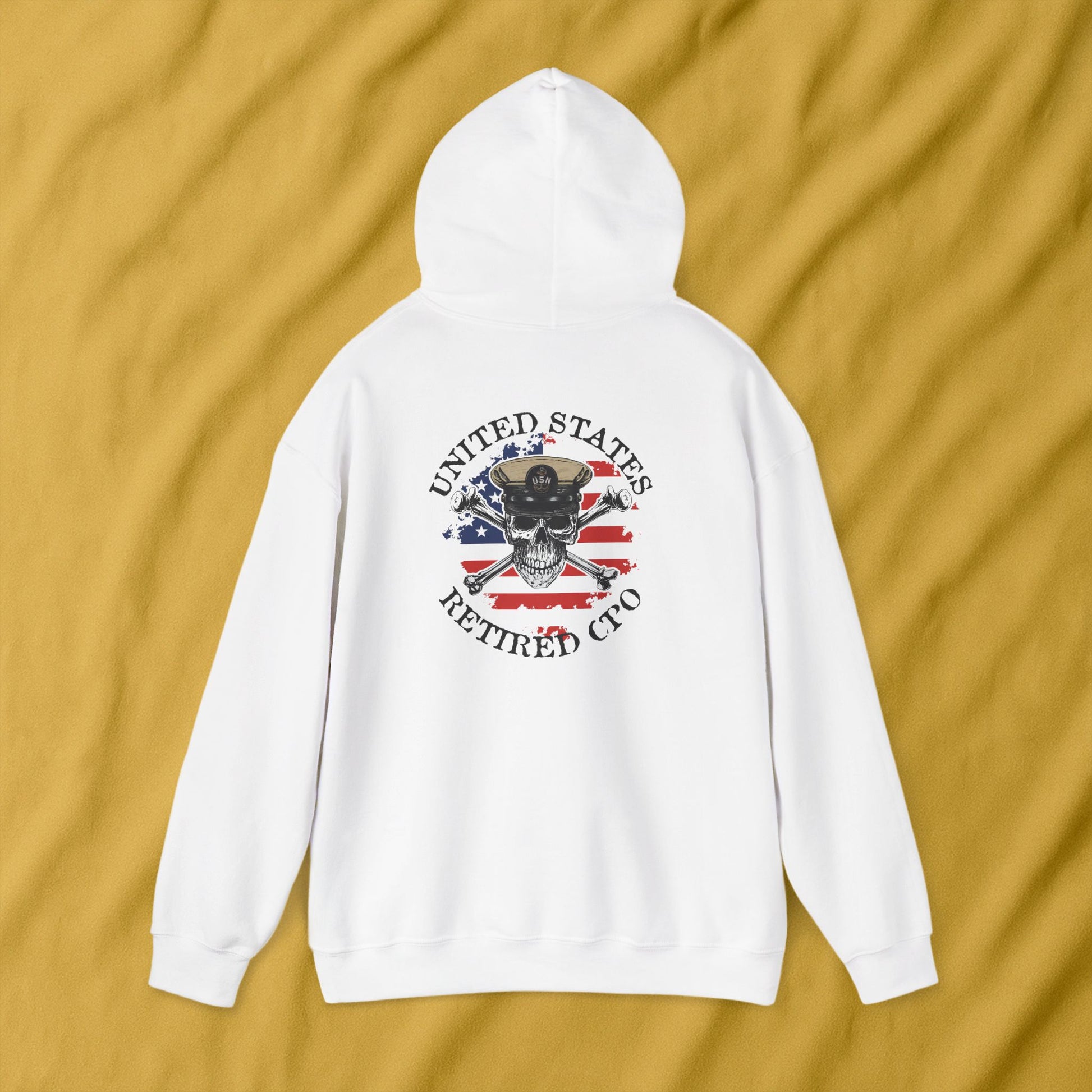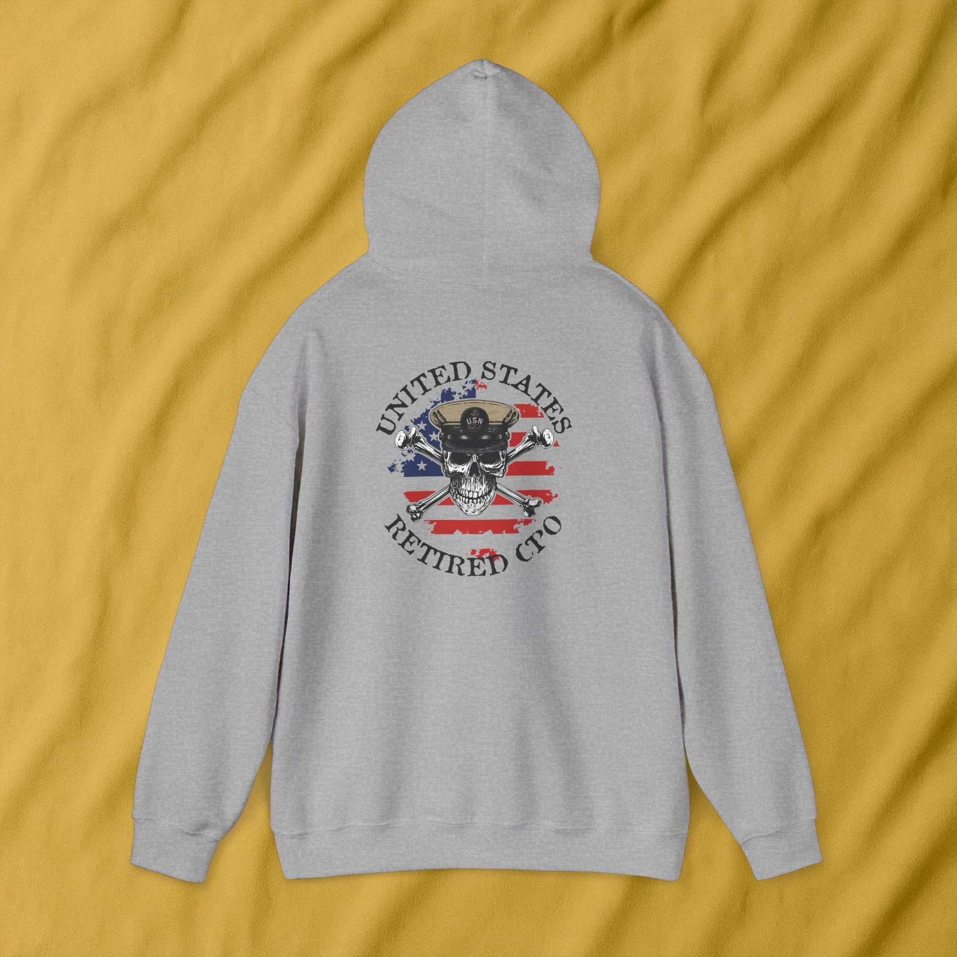 United States Retired CPO Skull Crossbones Chief Petty Officer on Distressed American Flag Mini Front Unisex Heavy Blend™ Hooded Sweatshirt