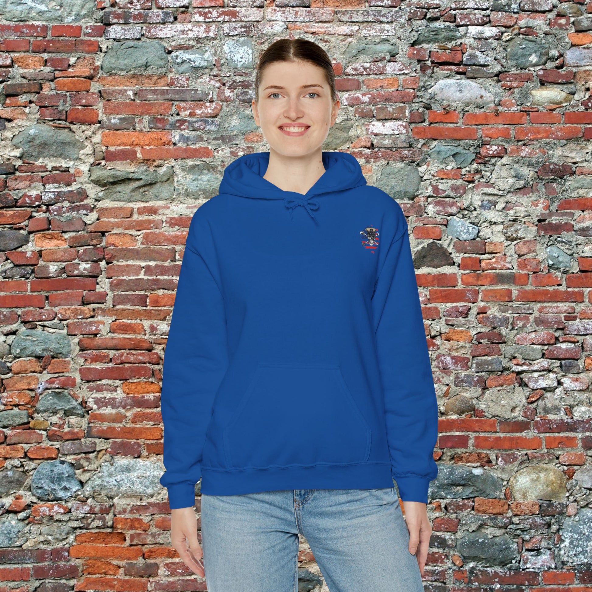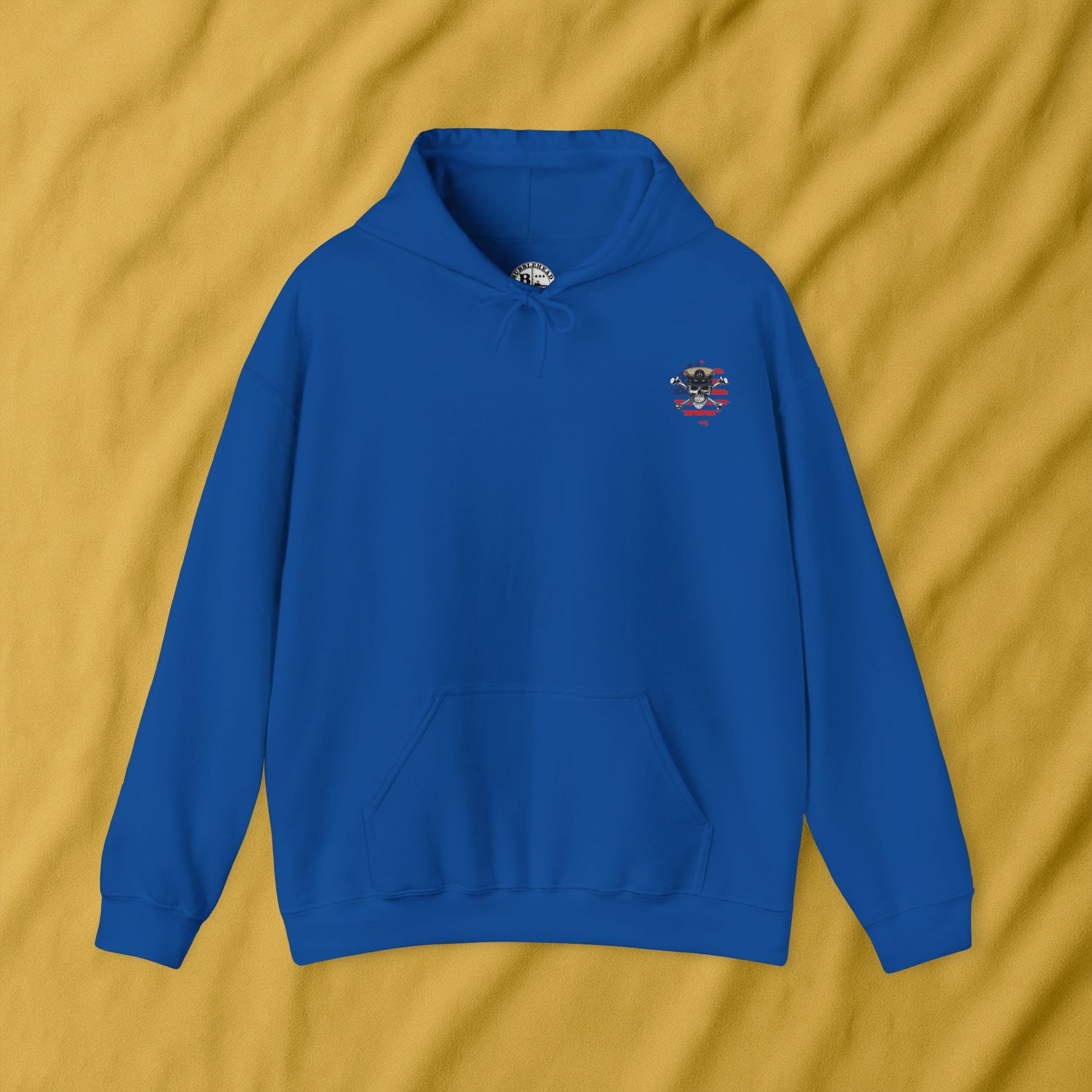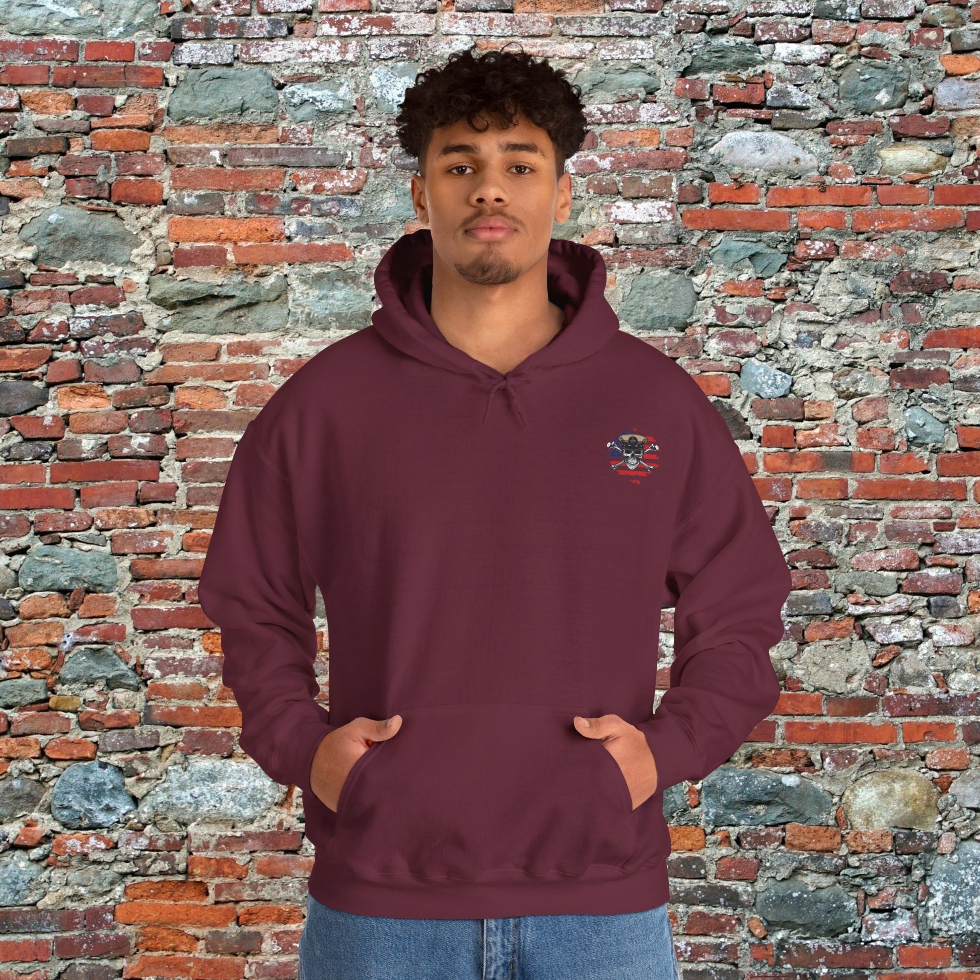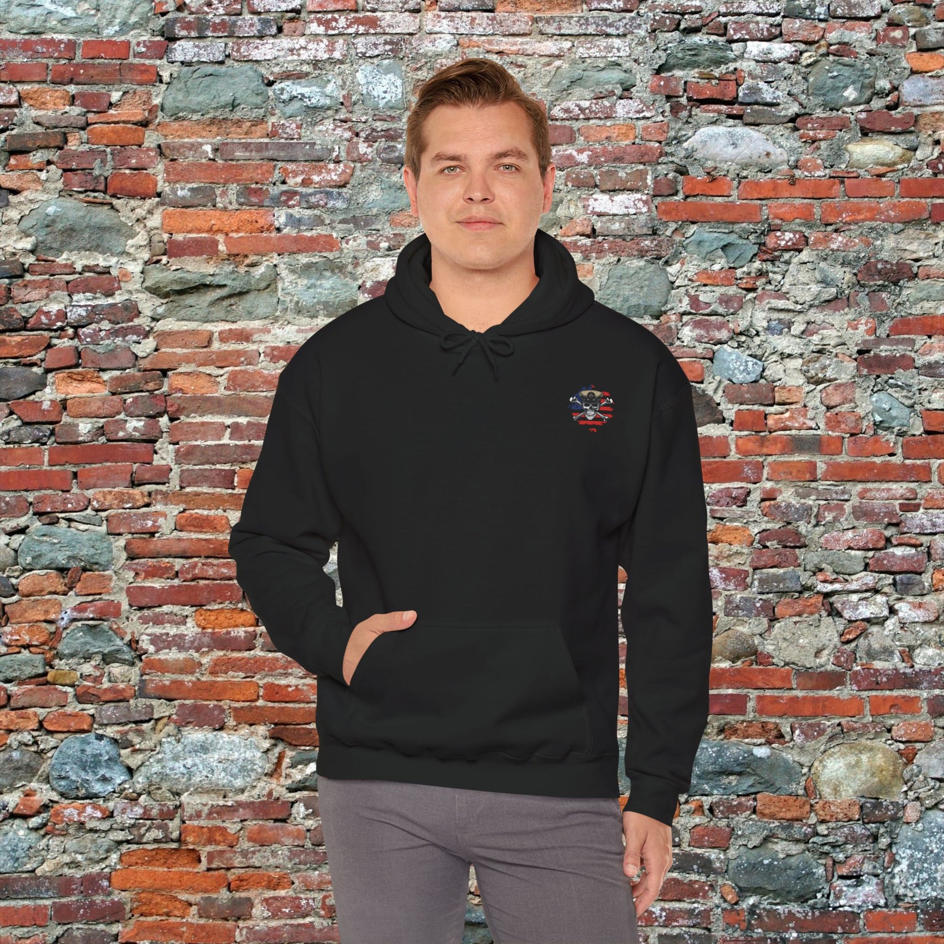 United States Retired CPO Skull Crossbones Chief Petty Officer on Distressed American Flag Mini Front Unisex Heavy Blend™ Hooded Sweatshirt
