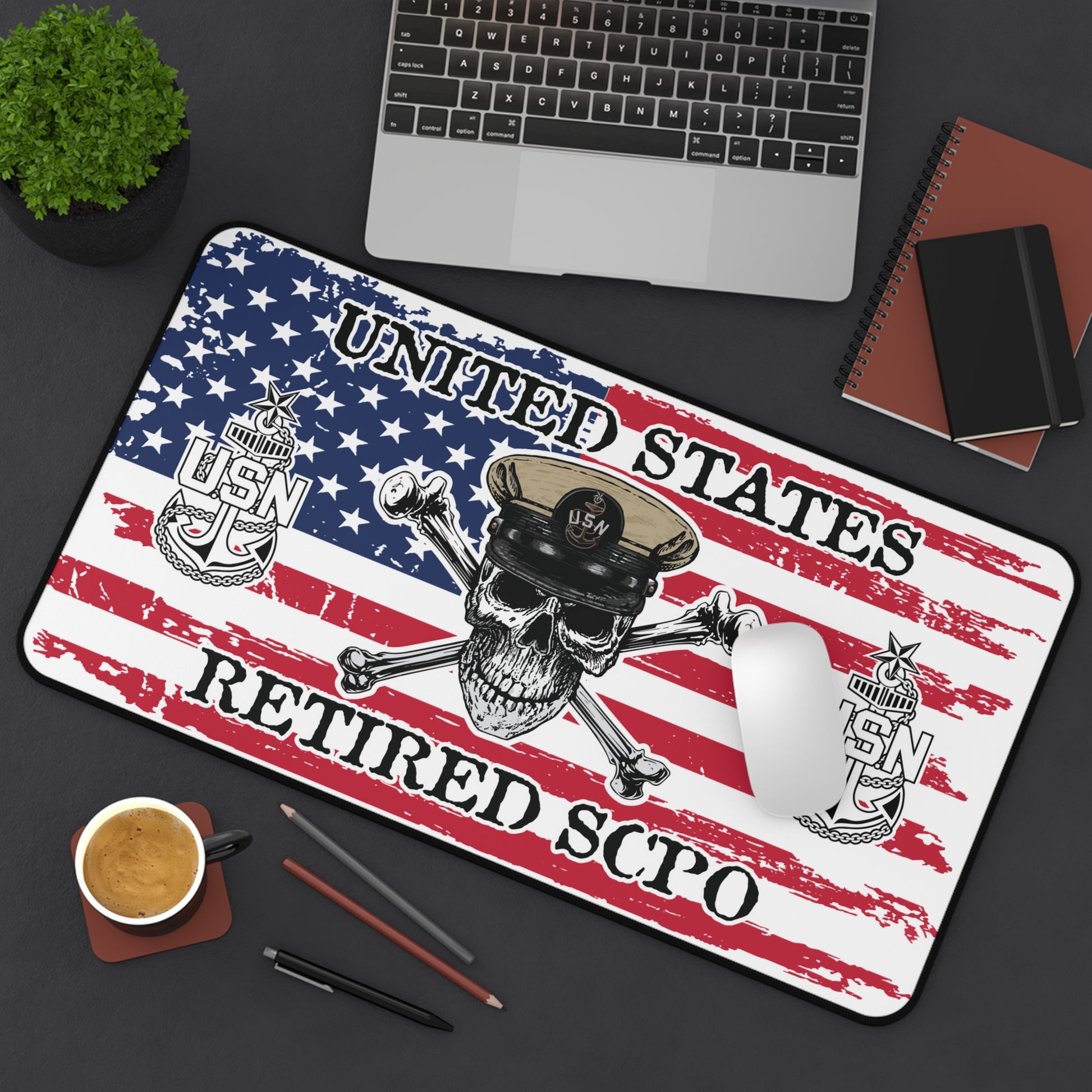United States Retired SCPO Skull Crossbones Senior Chief with Distressed American Flag Desk Mat
