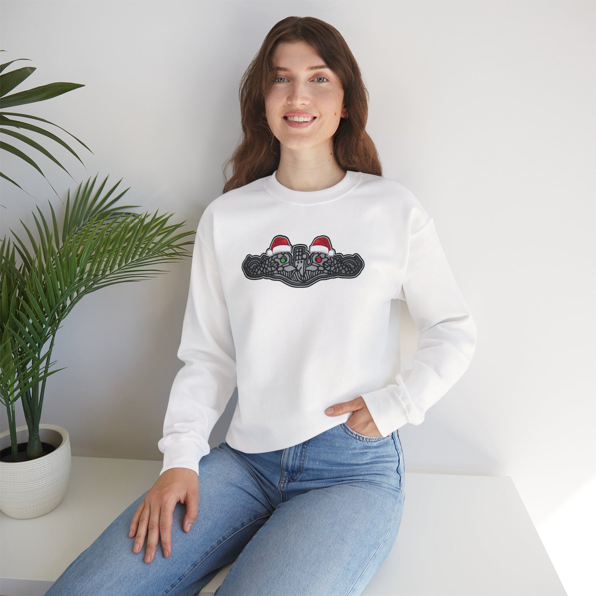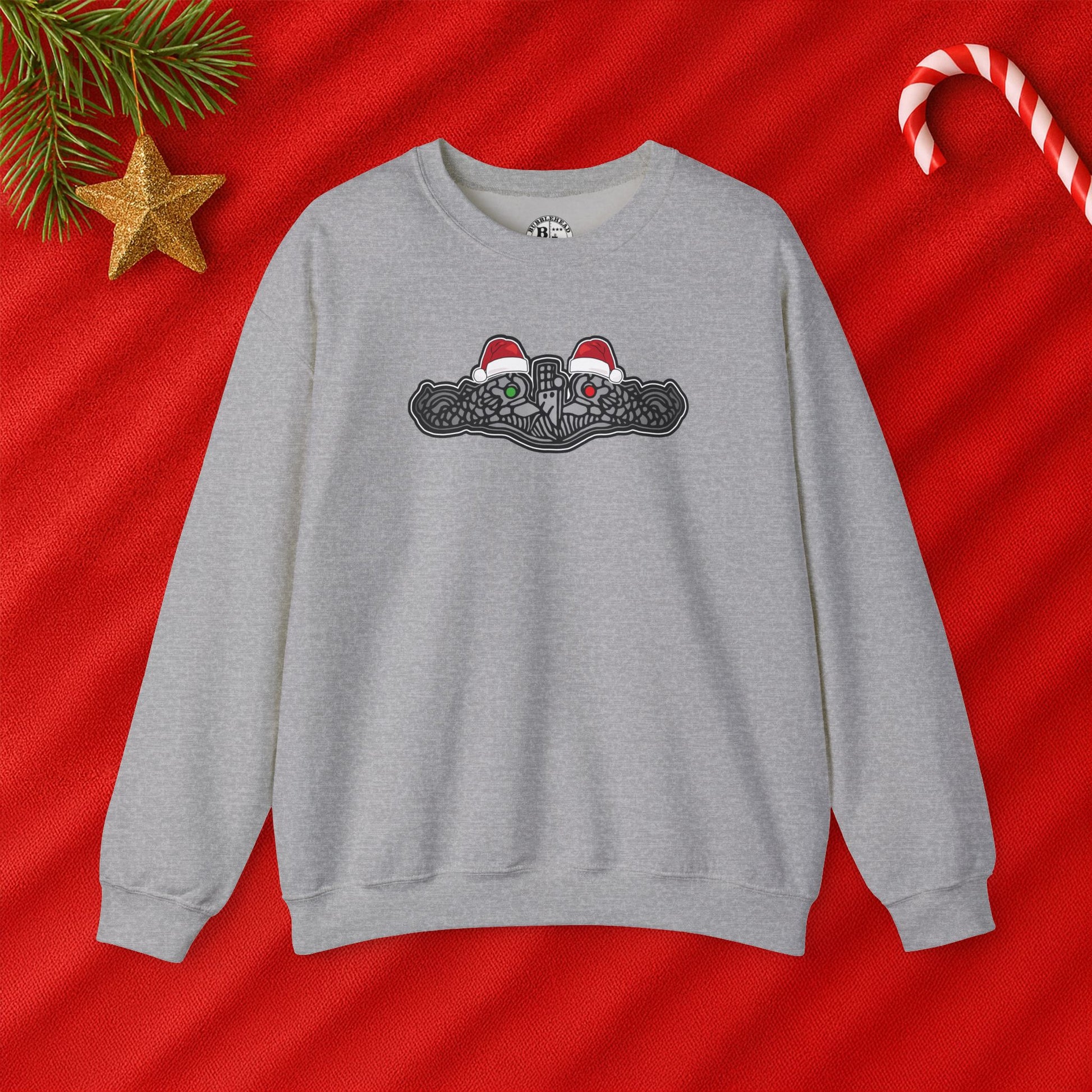 United States Submarine Force Silver Dolphins Christmas Santa Hats with Red and Green Eyes Unisex Heavy Blend™ Crewneck Sweatshirt