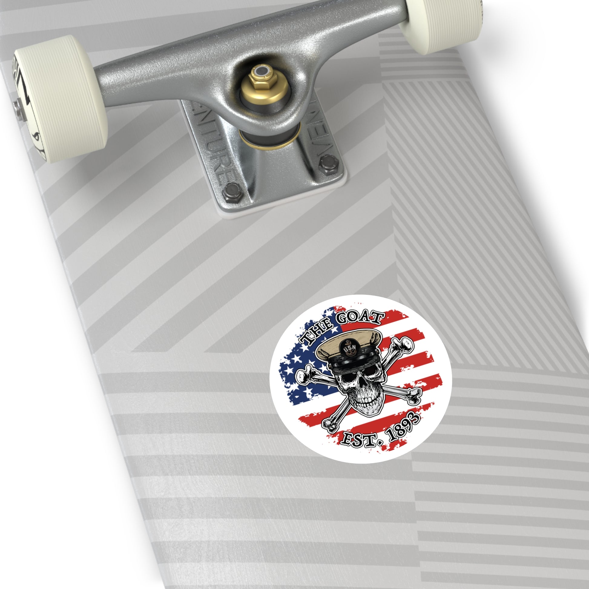 Bold and patriotic, this Chief “GOAT” skull sticker features the iconic Naval Chief’s hat, crossed bones, and American flag backdrop.