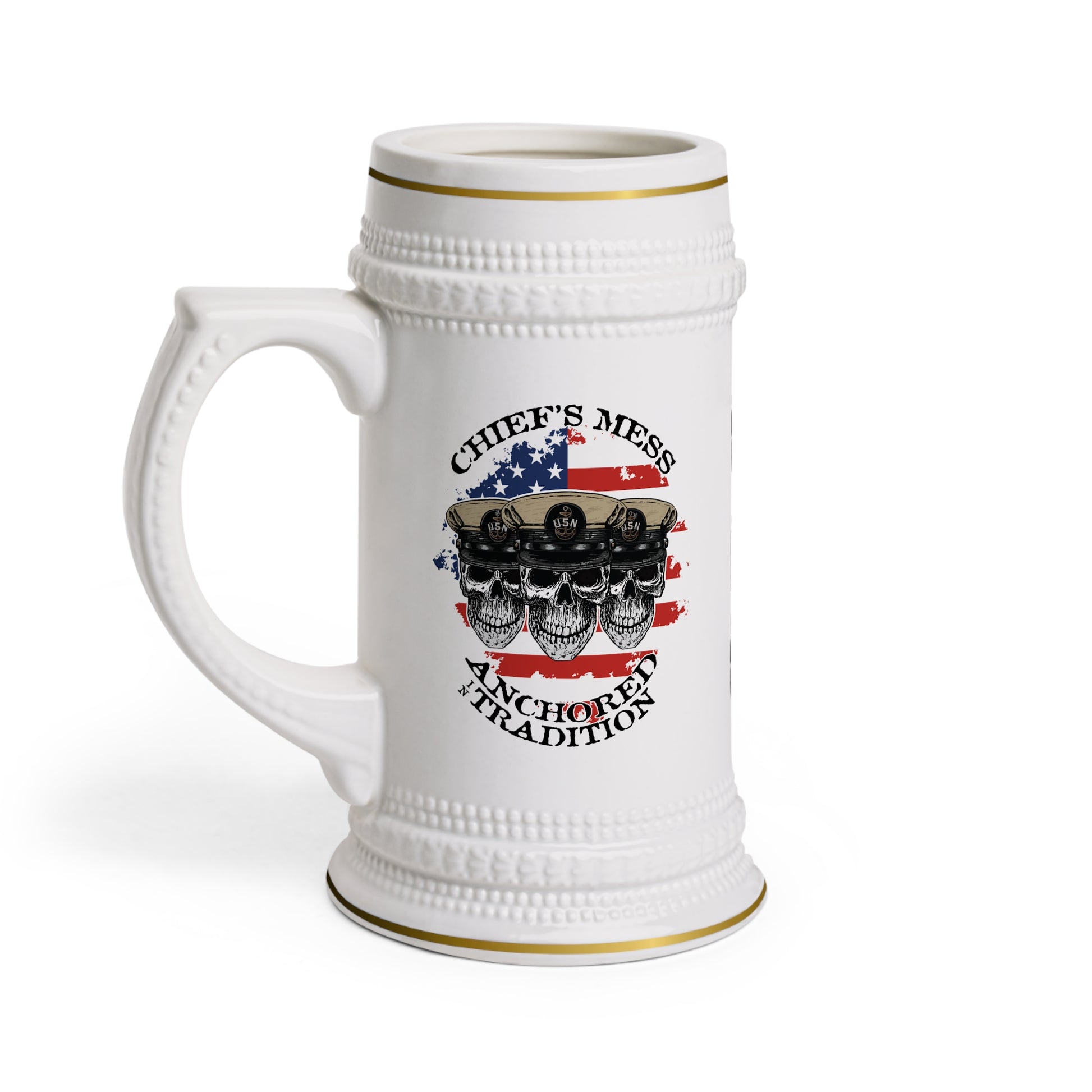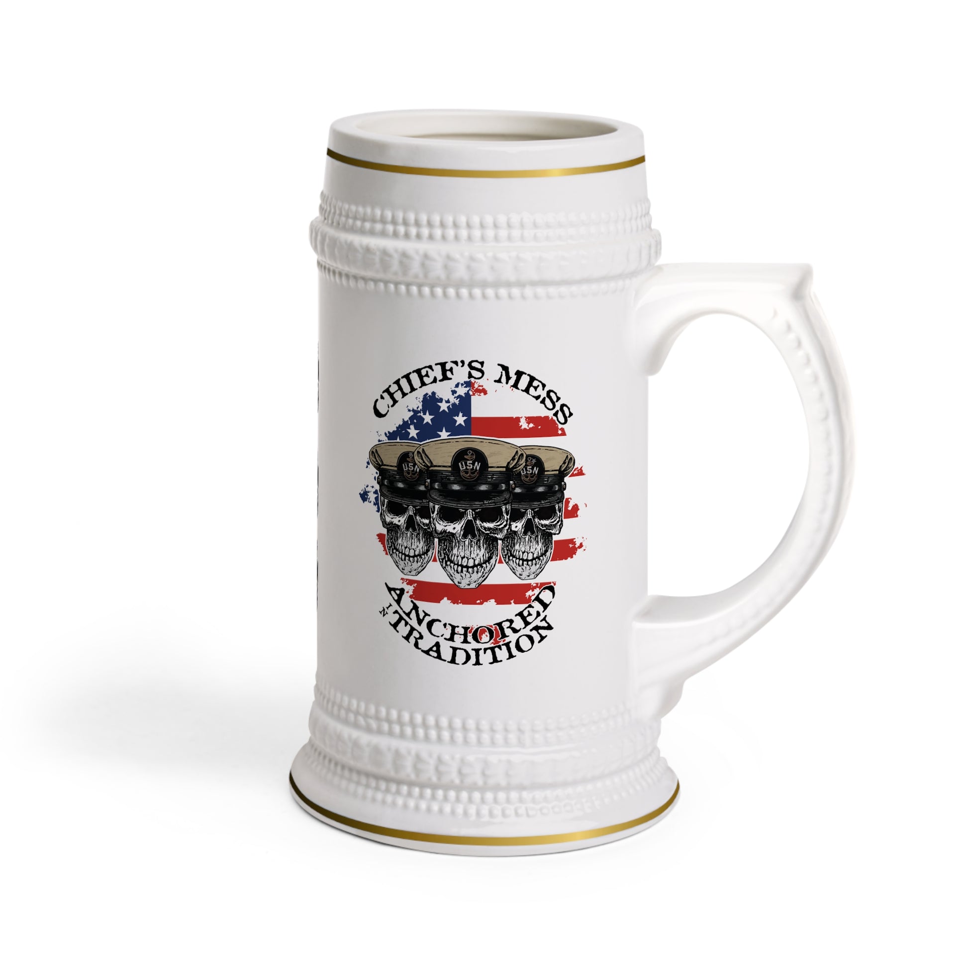 United States Navy Chief's Mess Anchored Tradition CPO Skulls on Distressed USA Flag Drinking Stein Mug. This design shows U.S. Chiefs (CPO, SCPO & MCPO) over a tattered American flag.
