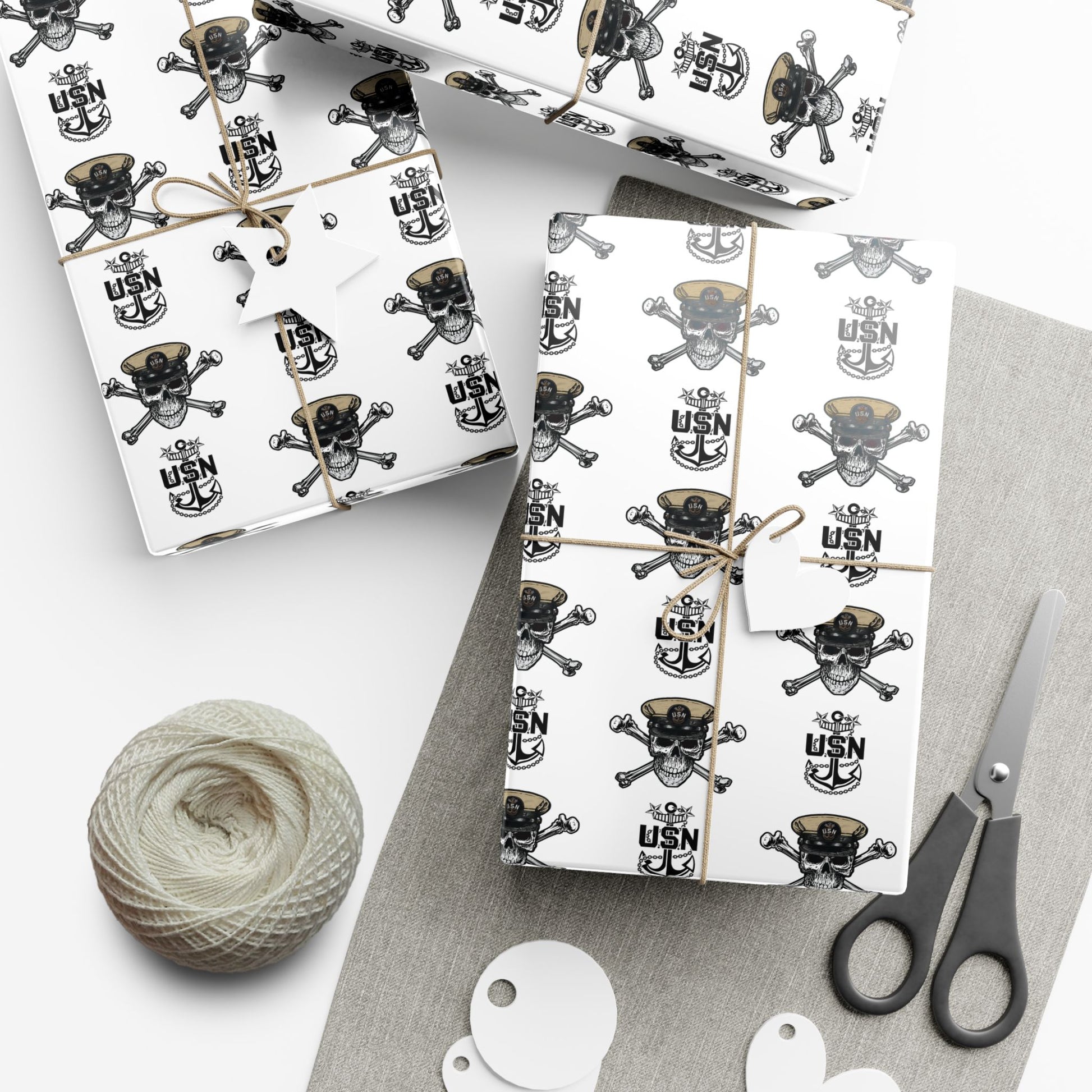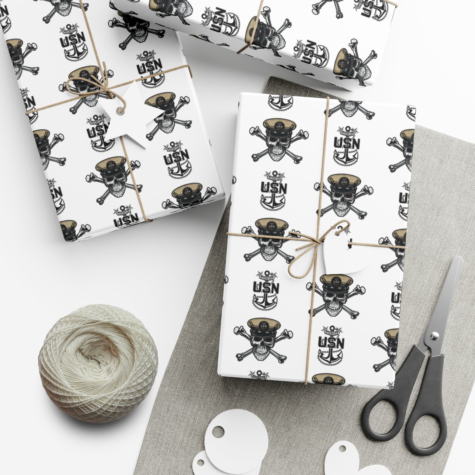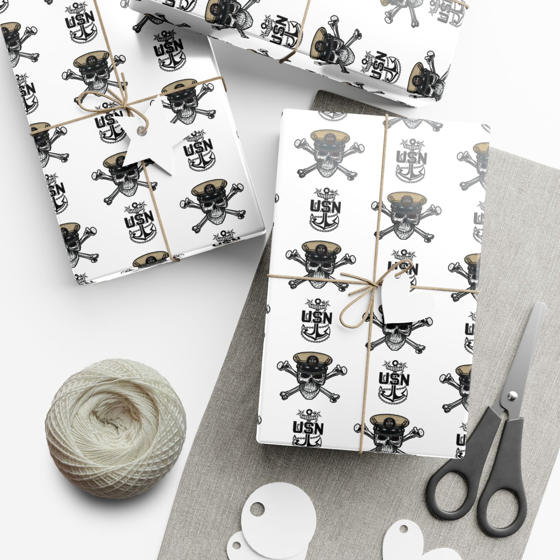 Make any gift bring an even wider smile to the receiver with this Navy Chief designed gift wrap paper. Show them how much thought you put into your gift and celebrate their special day with a personal touch. This naval design makes it clear that effort and style was put into this gift.