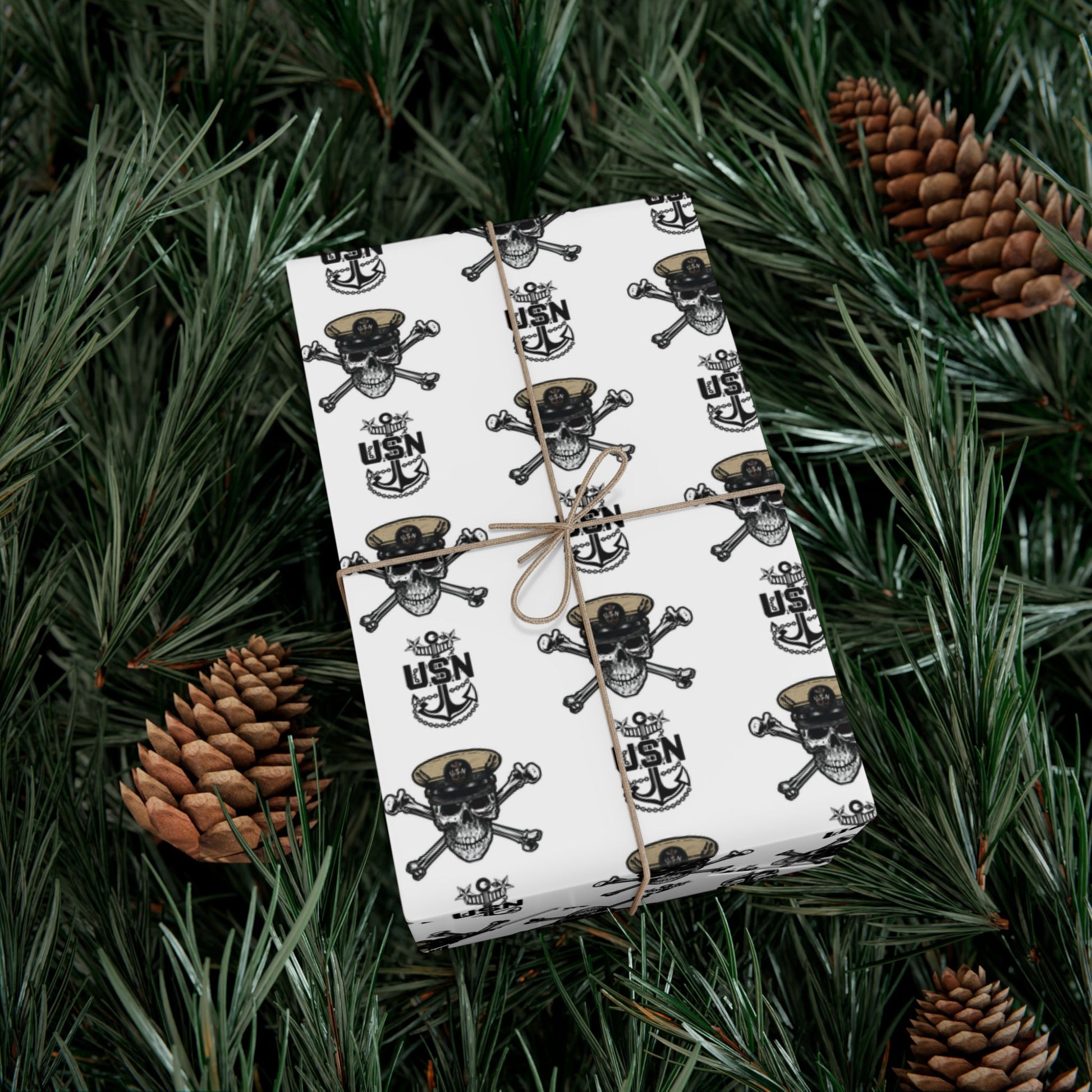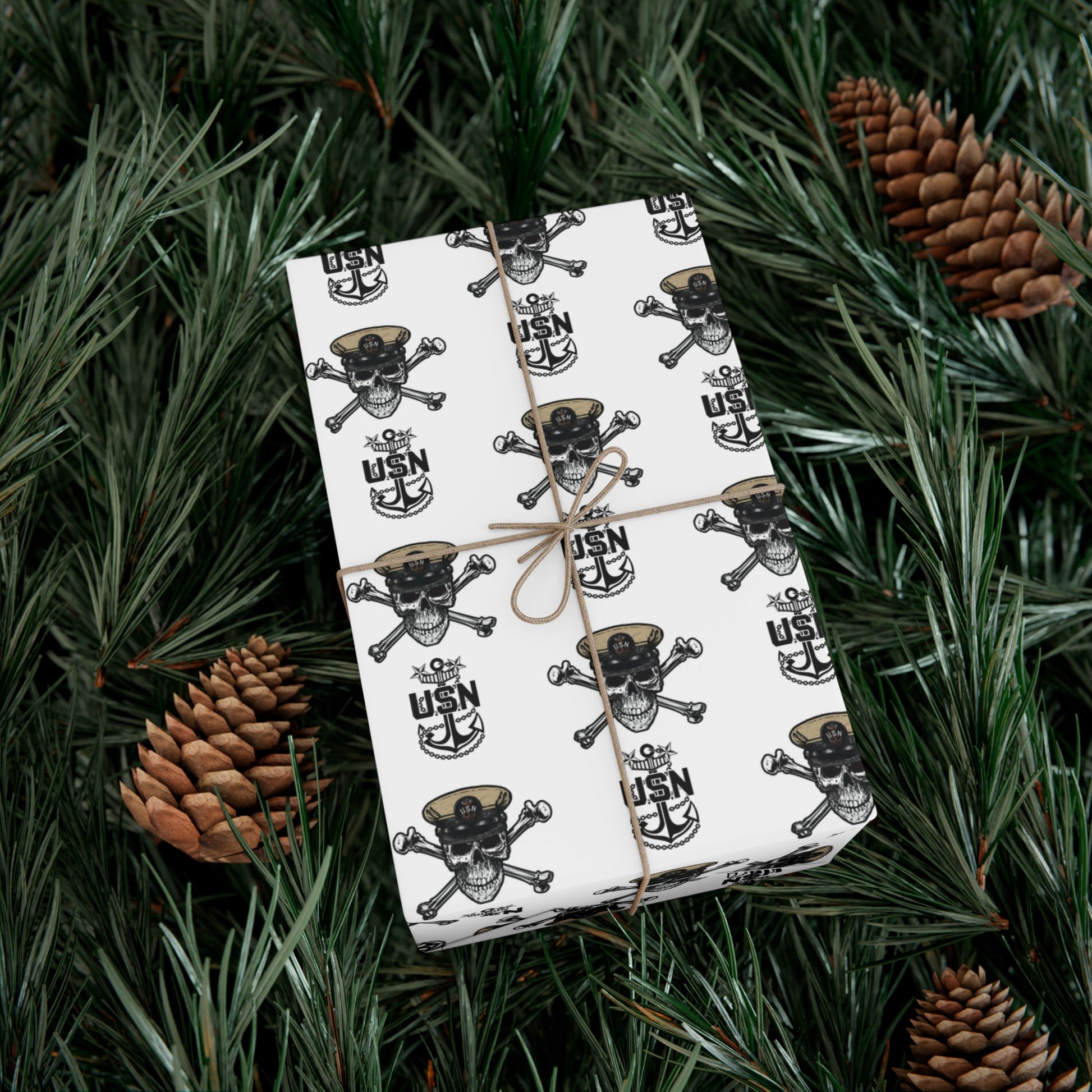 United States Navy Master Chief Petty Officer Skull & Crossbones with MCPO Anchors White Gift Wrapping Paper.