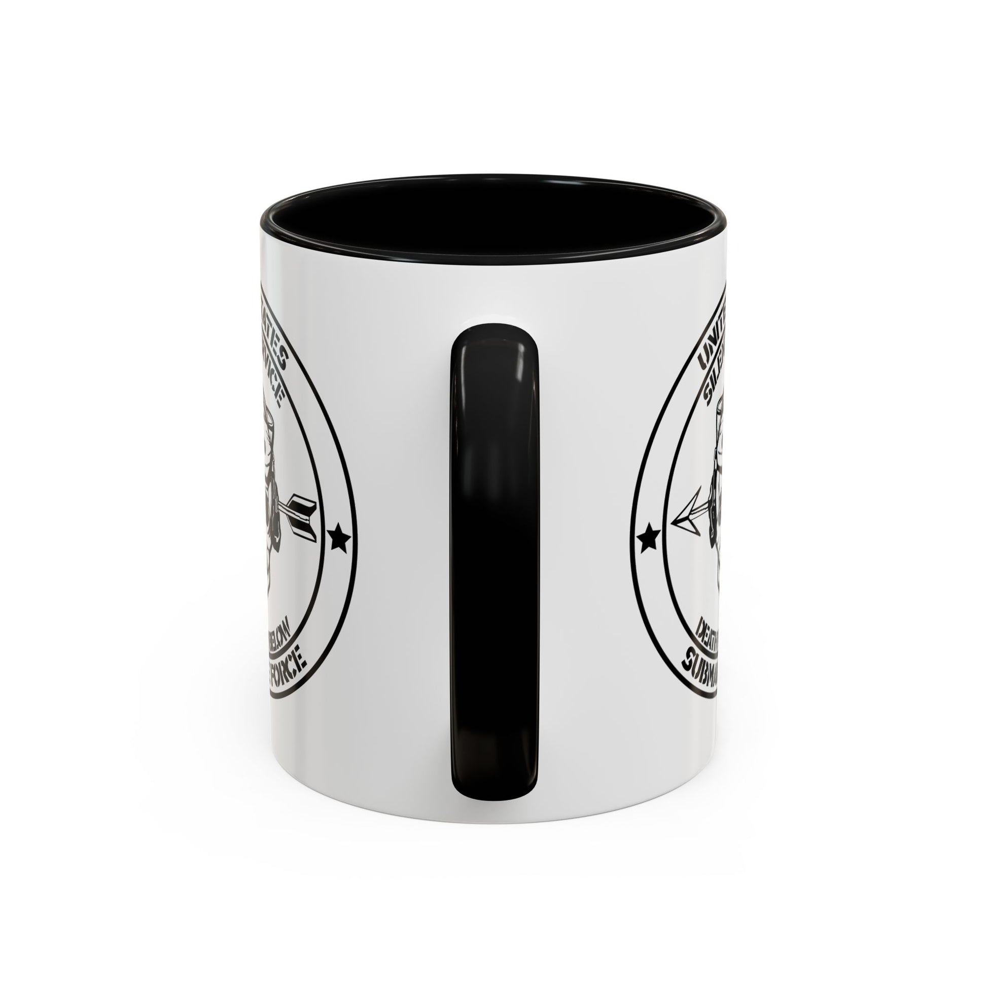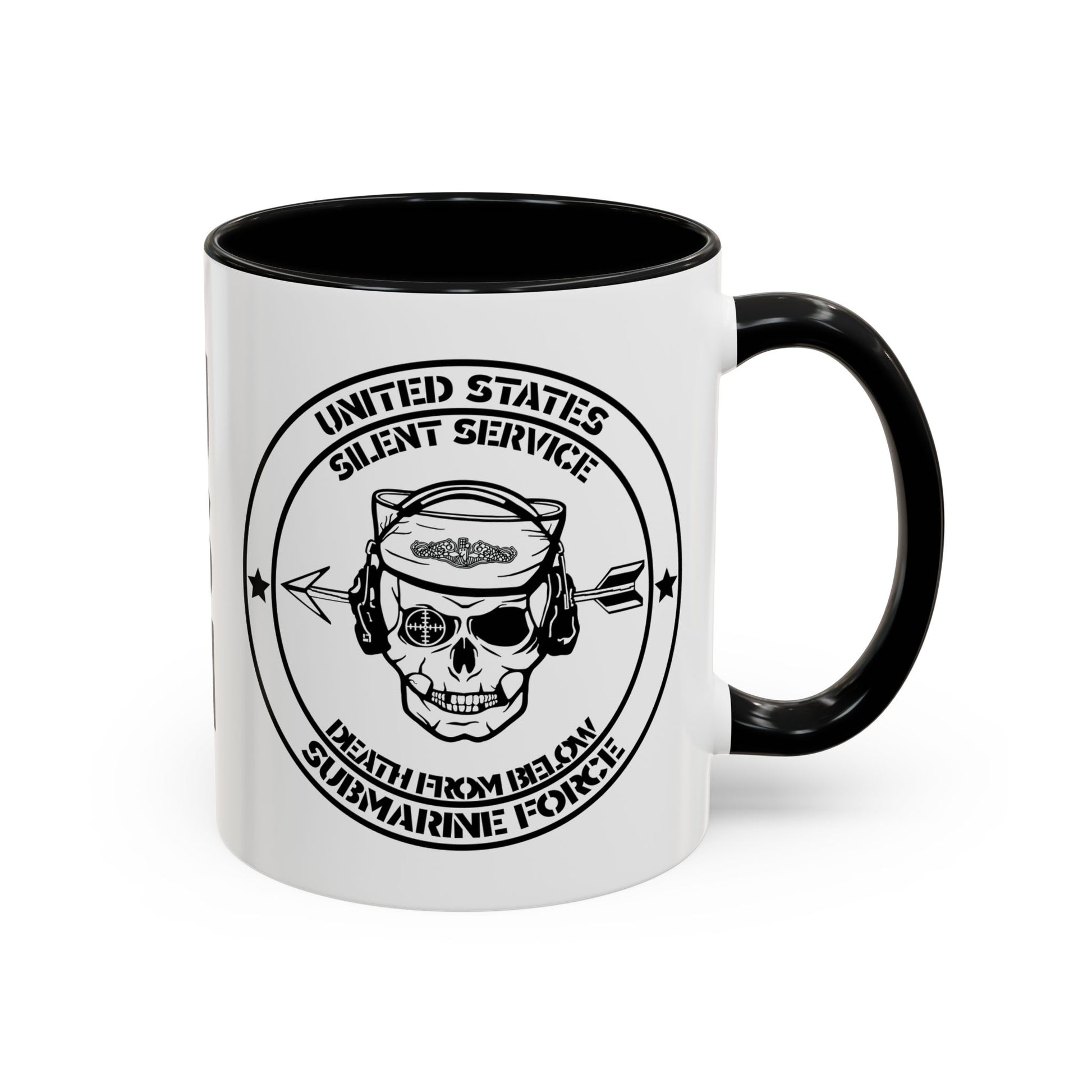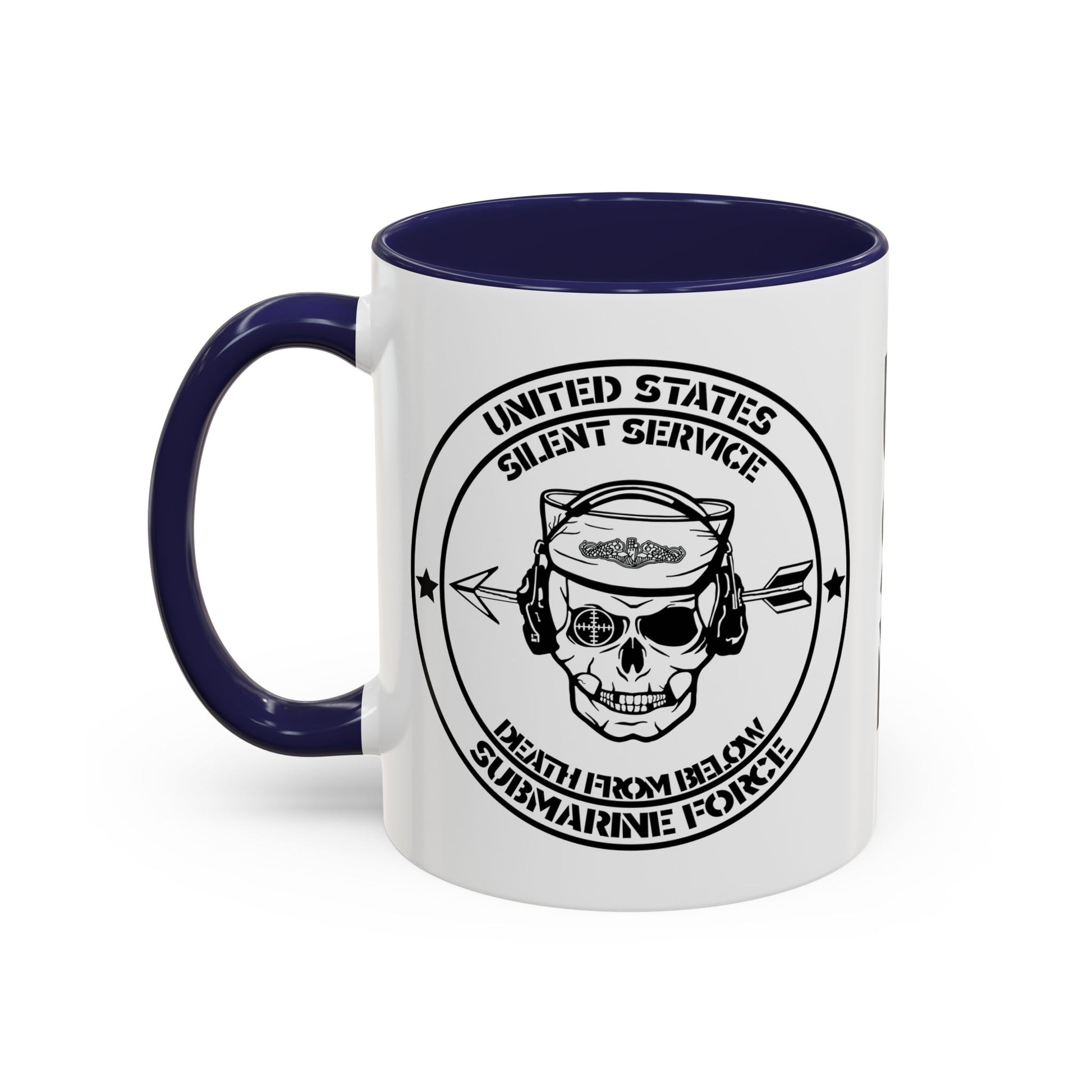 United States Navy Submarine Force Silent Service Death from Below Sailor Skull Ceramic Two-Tone Accent Coffee Mug.
