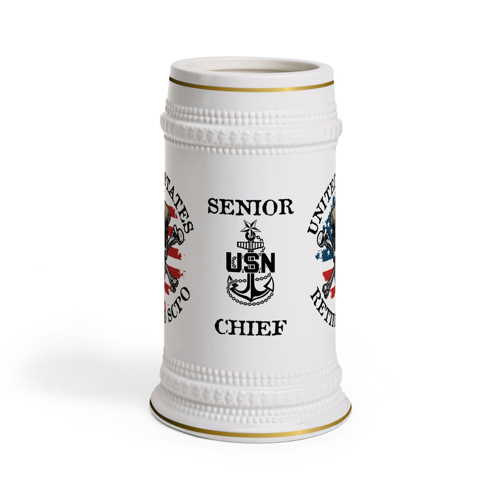 United States Retired Senior Chief Petty Officer Skull Crossbones with Distressed American Flag Stein Mug.